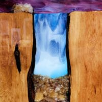 Artist Statement: “My artwork combines man-made materials with nature’s own art. My use of color, texture and resin compels viewers to actually touch the surface of my pieces. I frequently use river stone, granite, marble, copper, shell, tree bark, semi-precious stones and fossils in combination with man-made materials to create art pieces that convey nature’s peacefulness. Many of my pieces depict rivers, streams, landscapes and birds.”