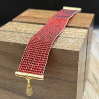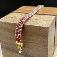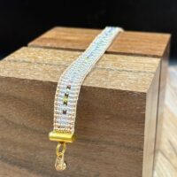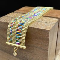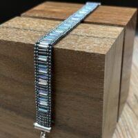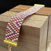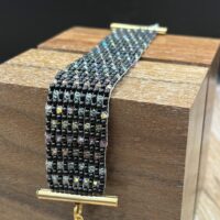 Nancy’s sister, Donna, gifted her a bead loom. She is inspired by the ancient history and relative culture of beading. She creates organically and intuitively, weaving with Miyuki Glass Seed Beads. Miyuki beads are an essential part of Japanese textile and jewelry-making traditions, with a long history of craftsmanship and precision. Her beadwork may include the use of crystals, a variety of Jaspers, Turquoise, Carnelian, Onyx, Tiger’s Eye, Quartz, Opalite, Lapis Lazuli and Labradorite and Mother of Pearl and Crystals.