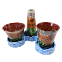 Her love of abstraction and the story-driven Australian Aboriginal works of art are combined in her colorful and painstakingly created ceramic vessels.