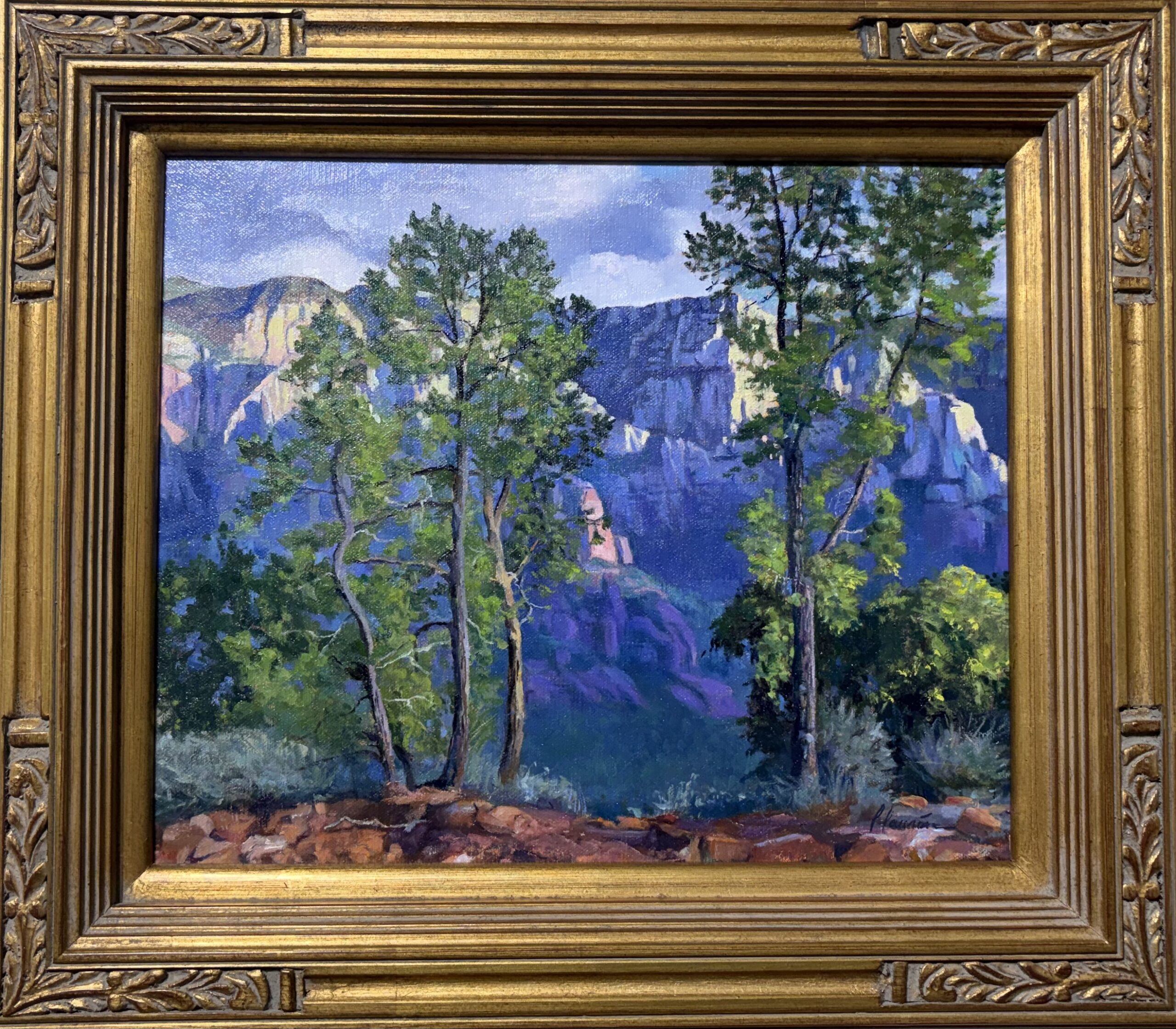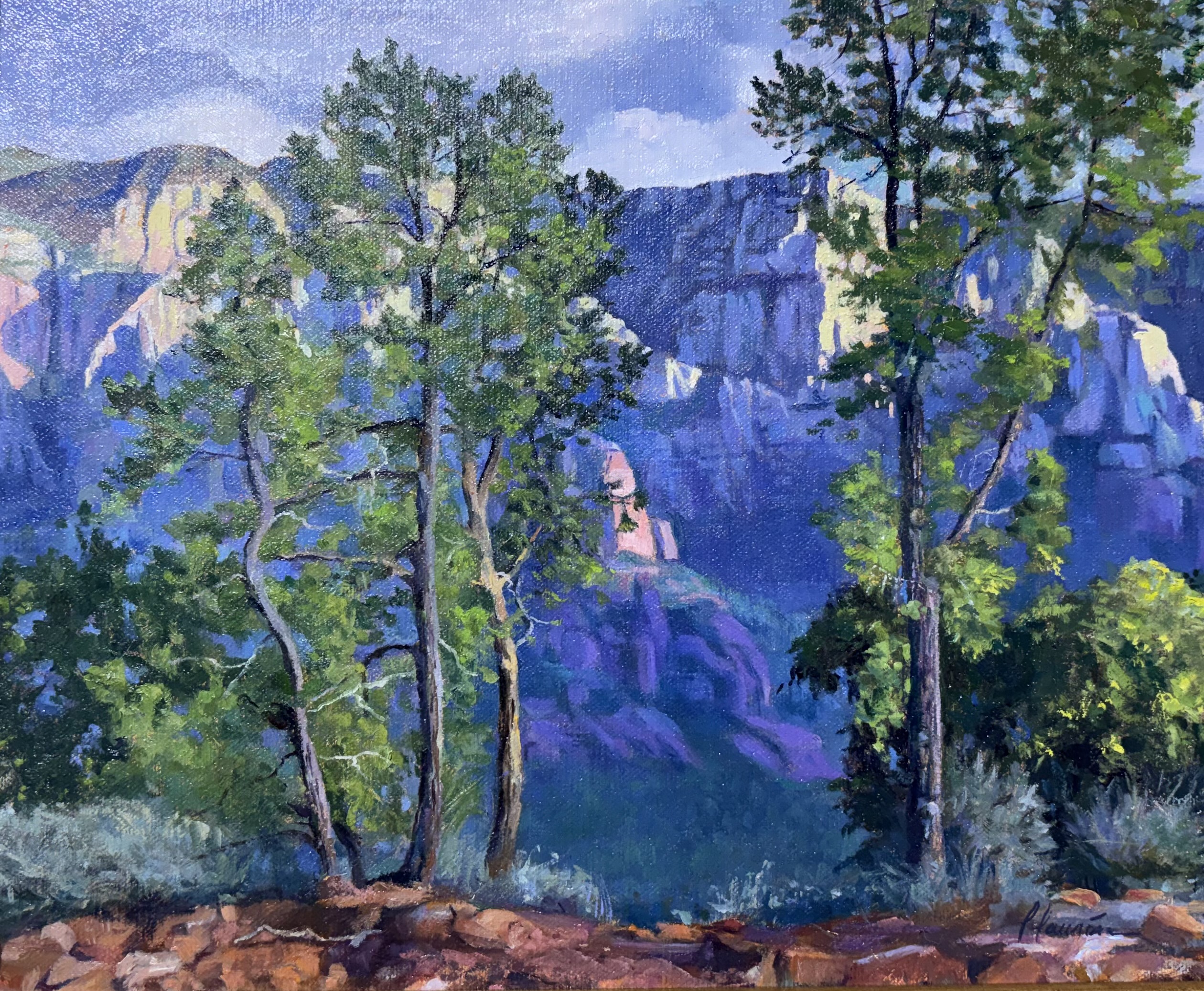 Lili Laurin's western landscape paintings reflect the glow and dramatic light that are iconic of the Arizona landscape. An avid plein air artist, she is often out at the crack of dawn, on site and ready to capture the sunbathed scene of gorgeous early morning light. Without faithful adherence to regular plein air excursions, her studio effort could not reflect the knowledge gained from that important experience. She applies her hard earned knowledge to her larger works.  Lili makes several yearly excursions to paint at the Grand Canyon, which is one of the most complex challenging landscape scenes to distill onto a canvas. Another favorite subject of this landlocked artist is seascapes, so there are plans this year to travel to the California Coast. Ms. Laurin is regularly invited into prestigious national juried exhibitions and is he recipient of many awards including the Southwest Art Award of Excellence and the honorific Tucson Desert Art Museum Purchase Award for her painting of Lee's Ferry Landing, an almost dreamlike interpretation of a peaceful section of the Colorado River in Glen Canyon. She most recently garnered the Realism Award of Excellence for Opuntia at the 2023 Oil Painters of American which recently sold at the Gallery of the Sedona Art Center.
