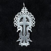 This cross was designed in silver from a large bronze cross we discovered on the island of Panarea in the fall of 2007. This island is a tiny gem, no automobiles, gorgeous scenery, and wonderful, friendly people.
