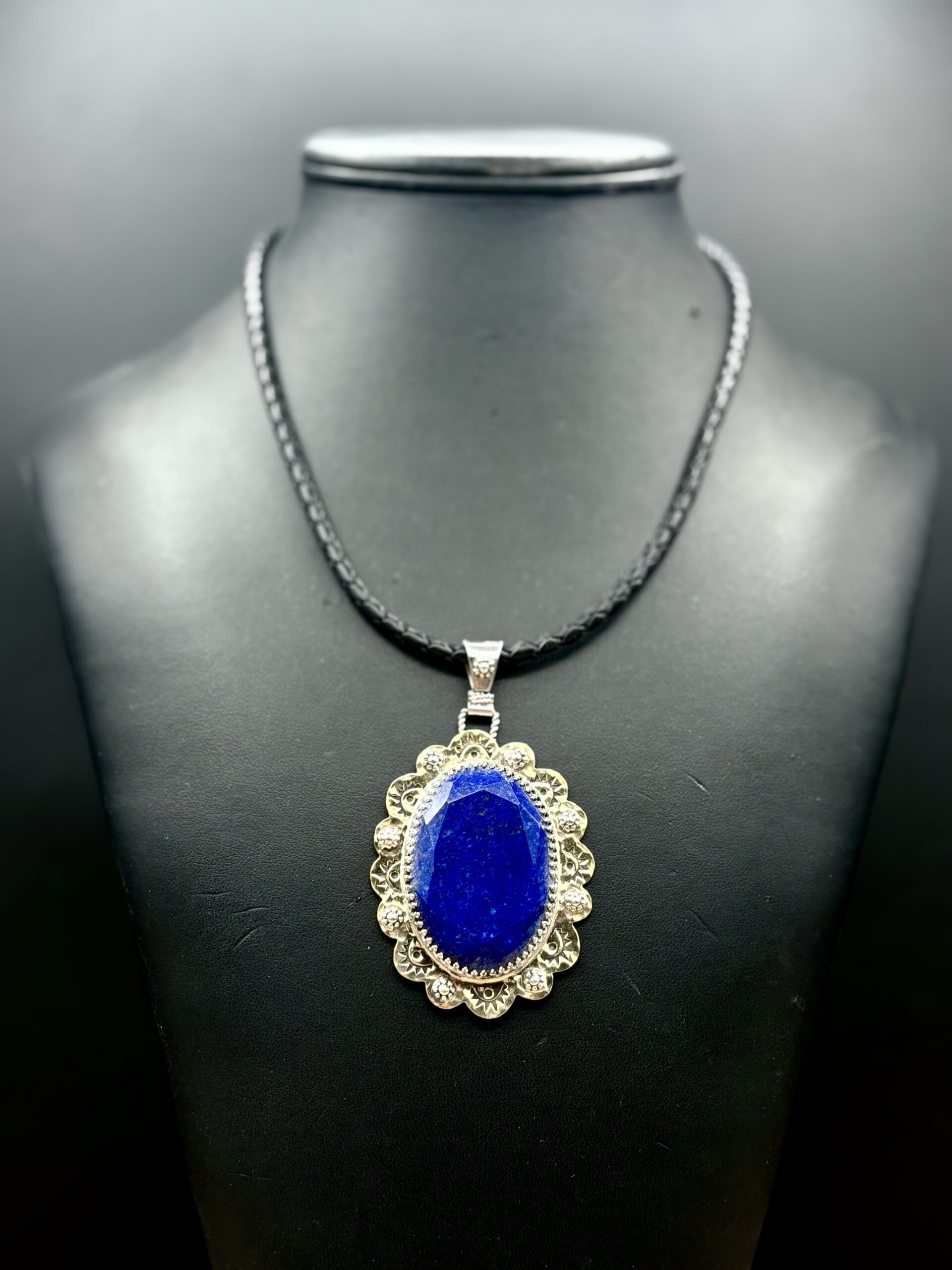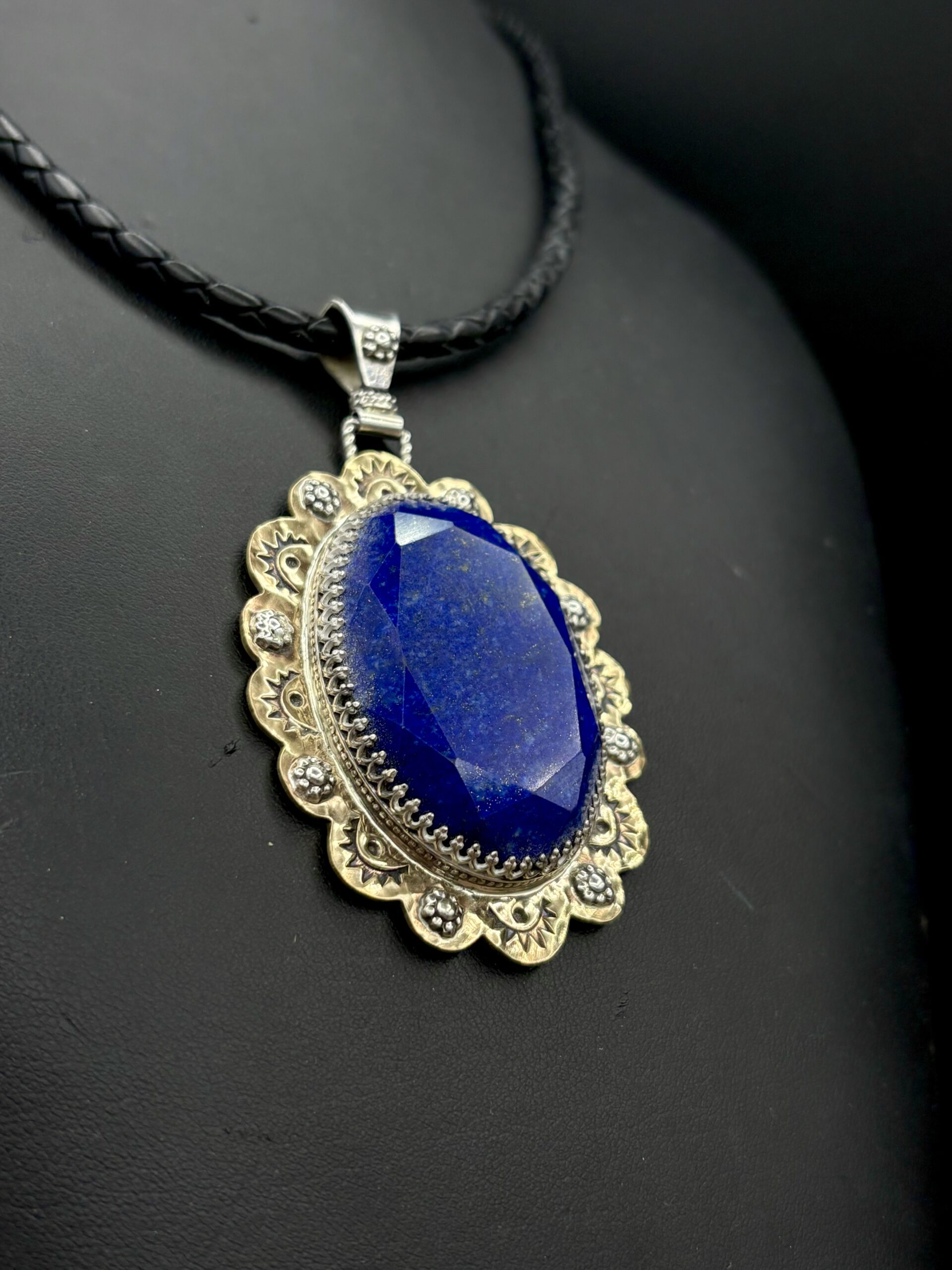 Brass with Sterling Silver Accents and Faceted Oval Lapis Lazuli Pendant on Braided Leather Cord by Tom Yazzie TYN946
