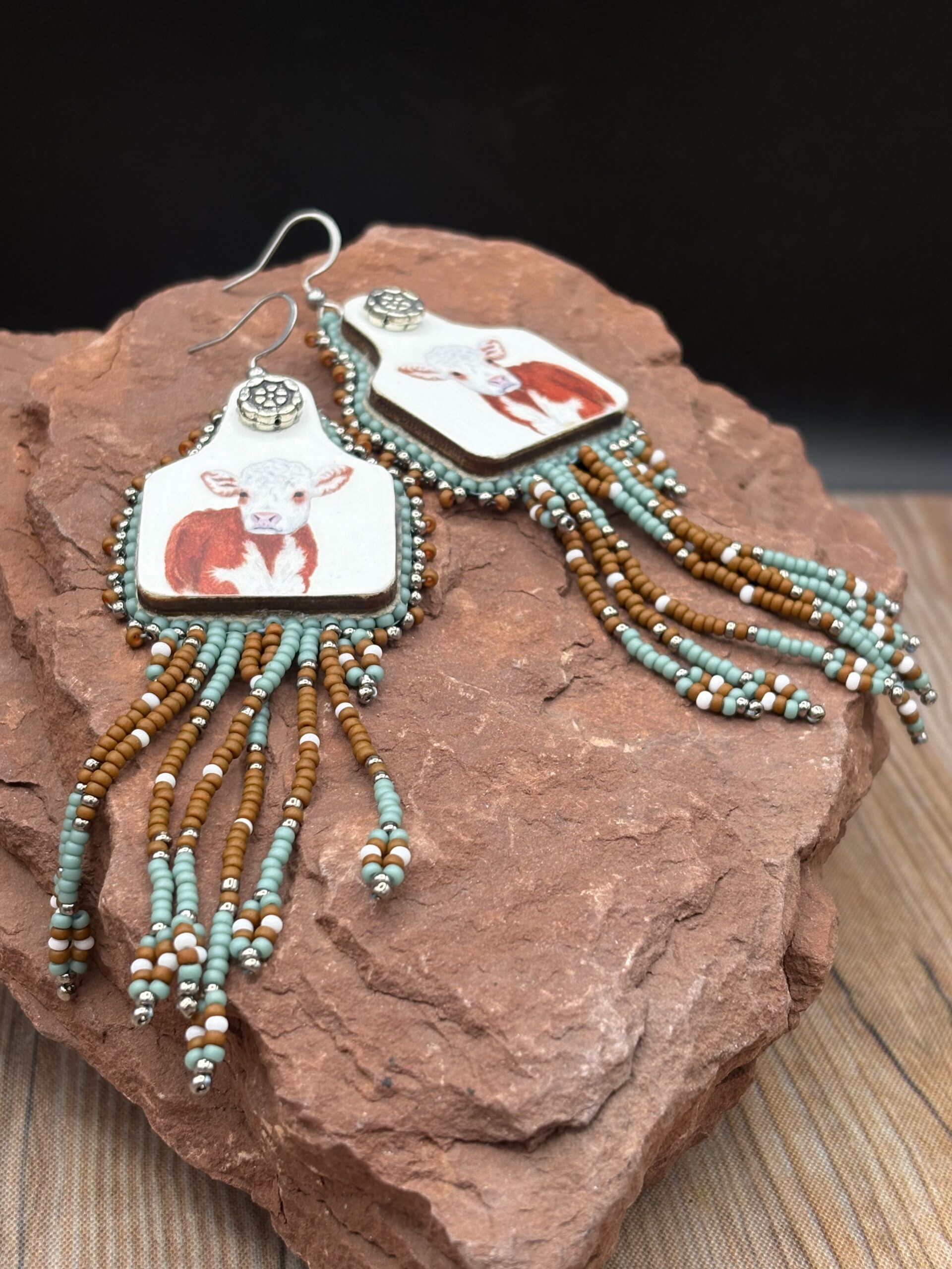 Original Calf Drawing Art Print on Wood Eartags with Silver flowers, Blue and Rust Fringe and stainless steel ear wires. Earrings by Sue Horine SHE67