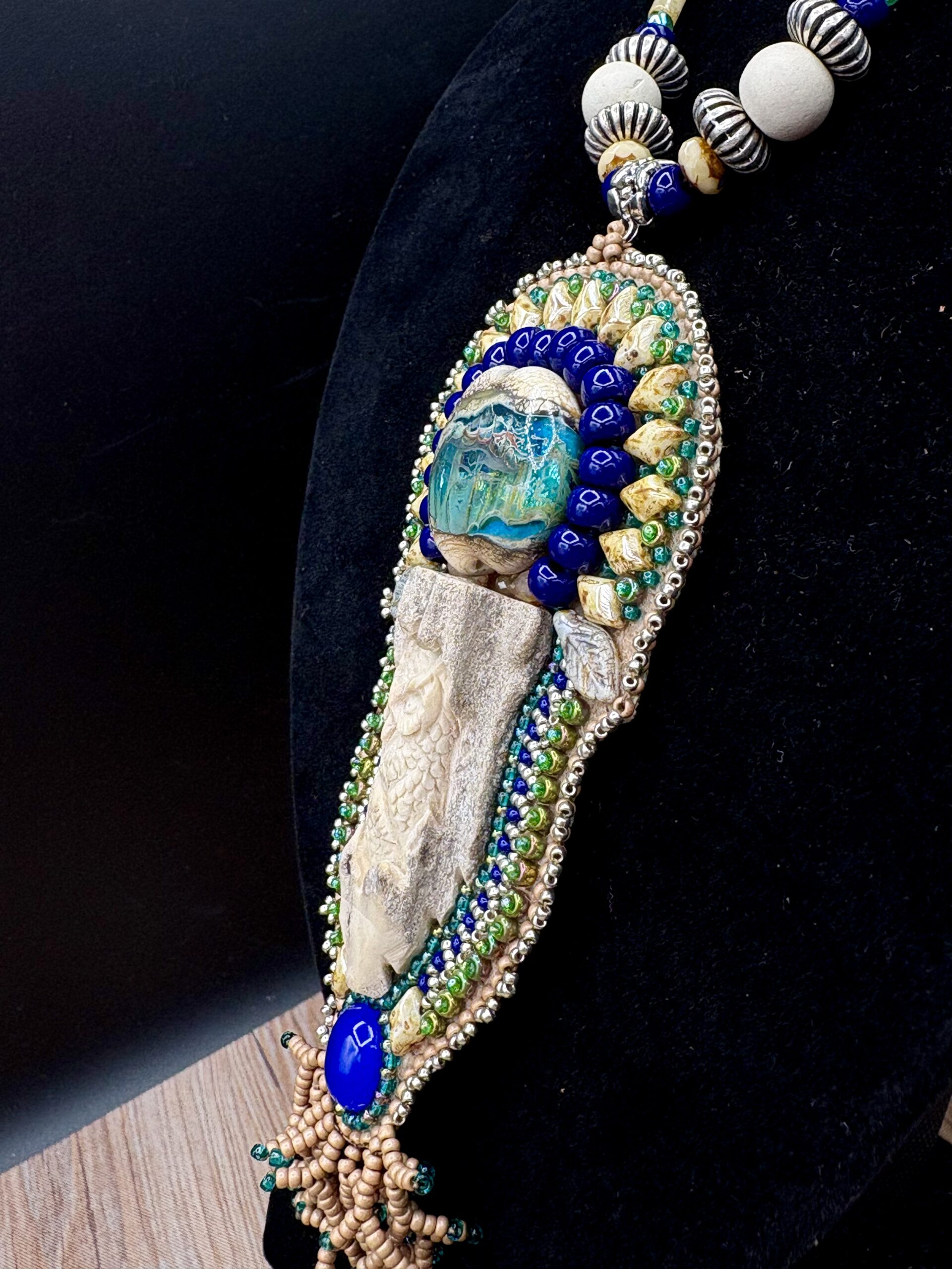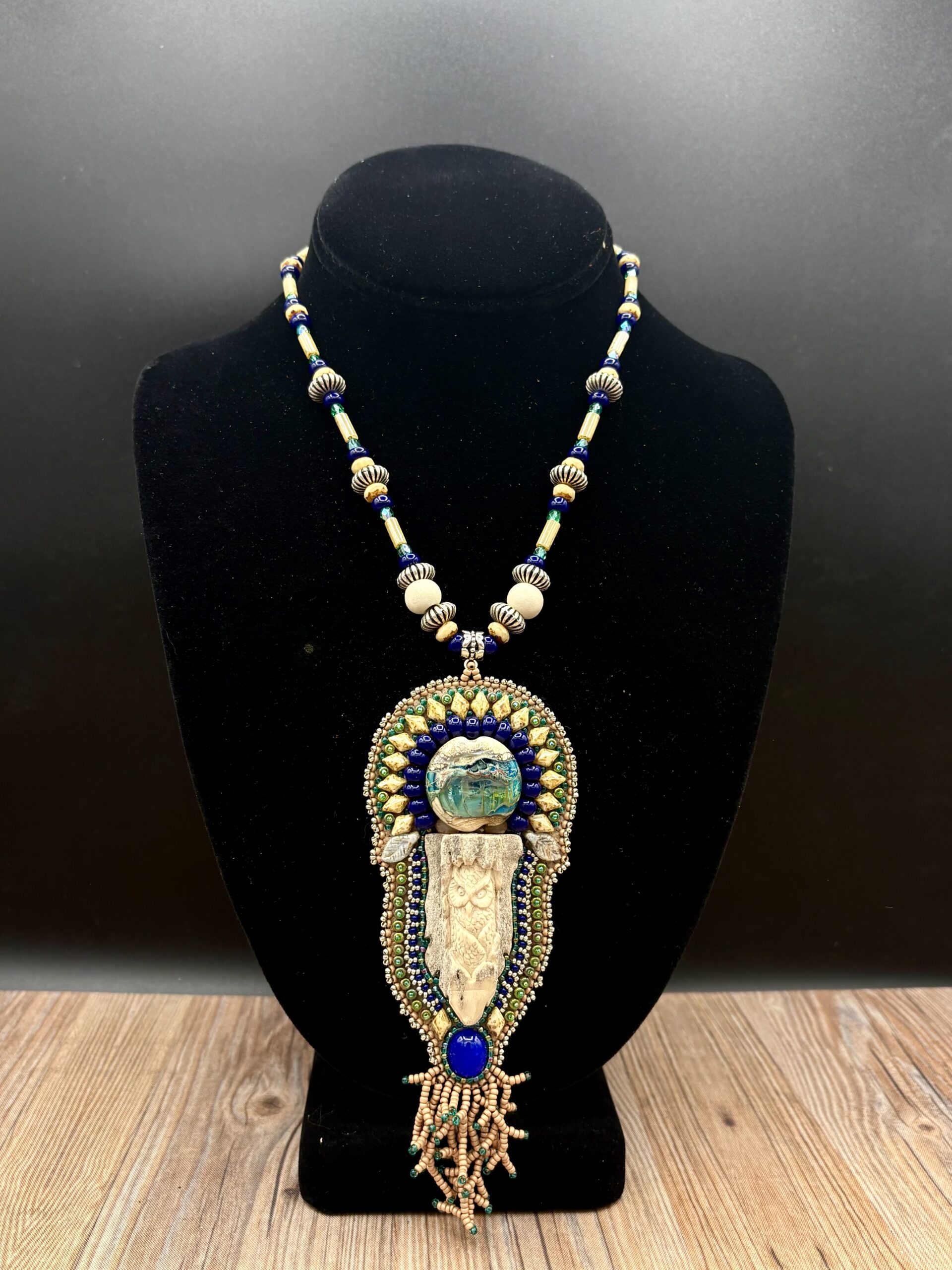 Carved Antler Owl with Lampwork Blue Agate on Beaded Necklace by Sue Horine N36