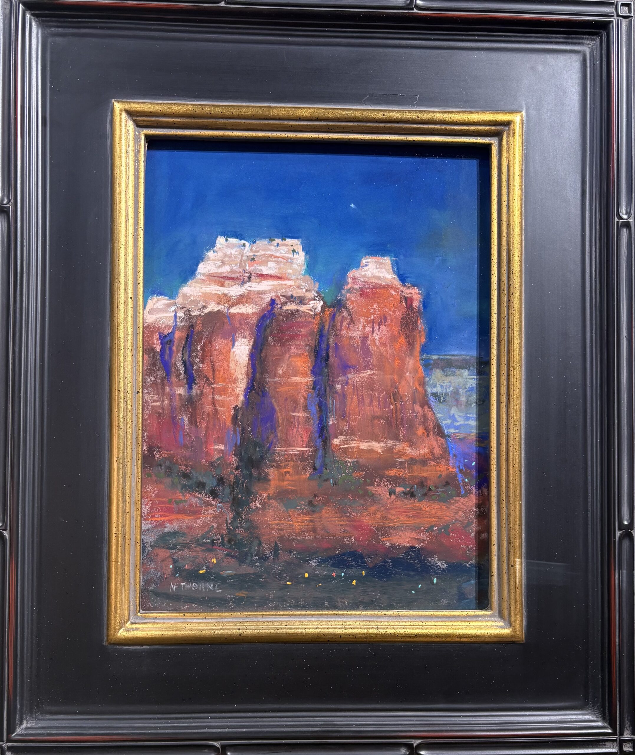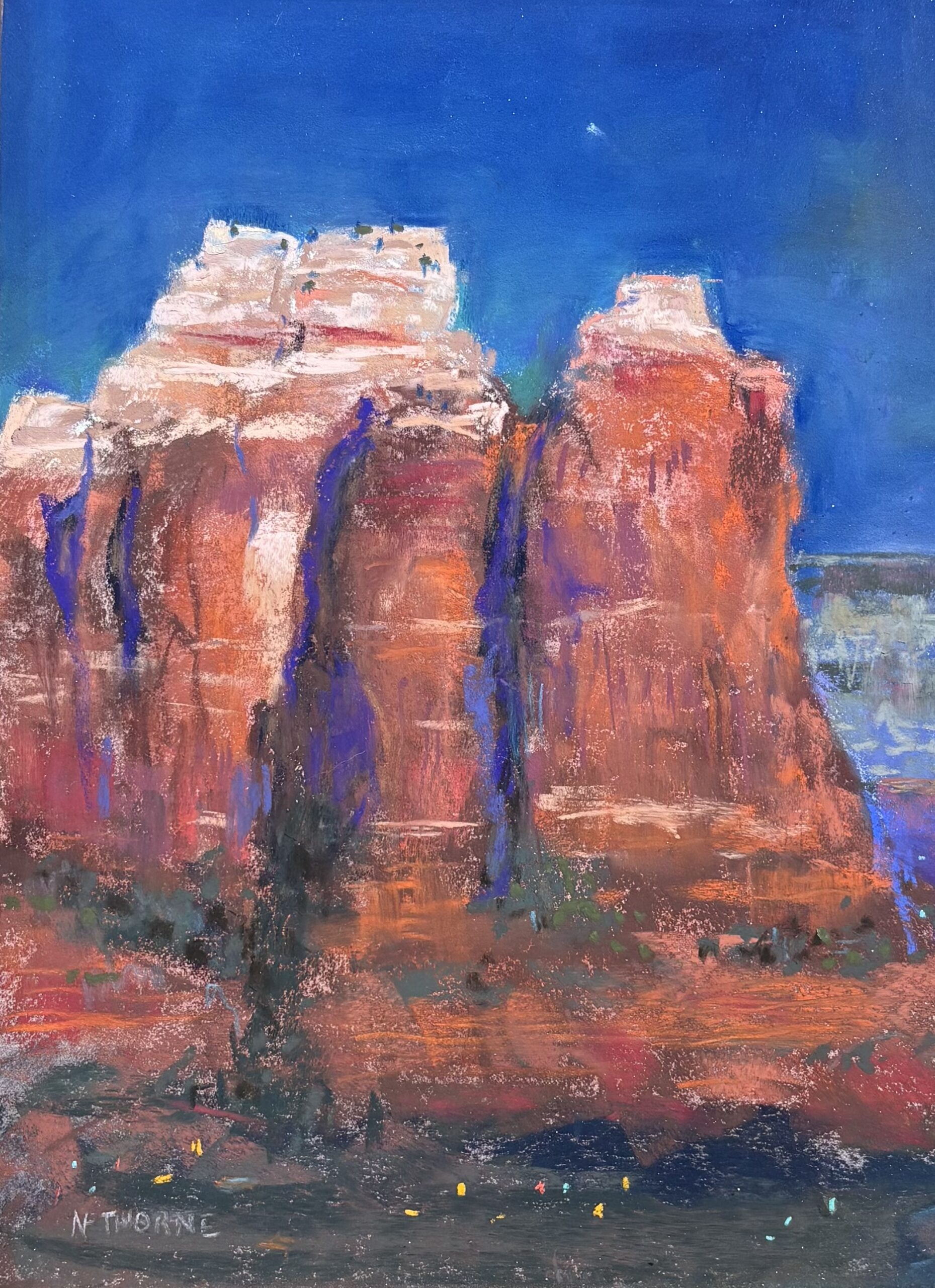 A transplant to Sedona, Nori Thorne now claims the desert Southwest as her home. She is a graduate in Studio Art from University of Pittsburgh and spent a semester at Habib Bourguiba University in Tunisia “painting in the souk and skipping French class.” Nori taught art and art history in Montgomery County, Maryland, Public Schools where she was the recipient of numerous grants from the Arts and Humanities Council, National Art Education Foundation, and the Fulbright/Hayes Scholarship. An award-winning pastelist, Nori received first place recognition in Tucson Pastel Society’s Juried Exhibition at the Amerind Museum. Other events include inclusion in Pastel Society of America’s Enduring Brilliance 2021, 2022 41st National Western Spirit Exhibition, 2024 99 Voices in Pastel, and 2023 and 2024 Ironwood Gallery Exhibit, Power of Pastels. “Little Red” was juried into the Women Artists of the West’s 54th National Exhibition at the Phippen Museum in 2024. She was a featured artist in Art of the West’s July/August 2023 issue. Currently she is working on a series of paintings inspired by ancient ruins and pictographs found in the red rock canyons near Sedona. Nori is Signature Member, Emerita of the Women Artists of the West, Pastel Society of the West Coast, President of the Arizona Pastel Artists Association and is a juried member of the Pastel Society of America. She is represented by Sedona Arts Center Gallery.