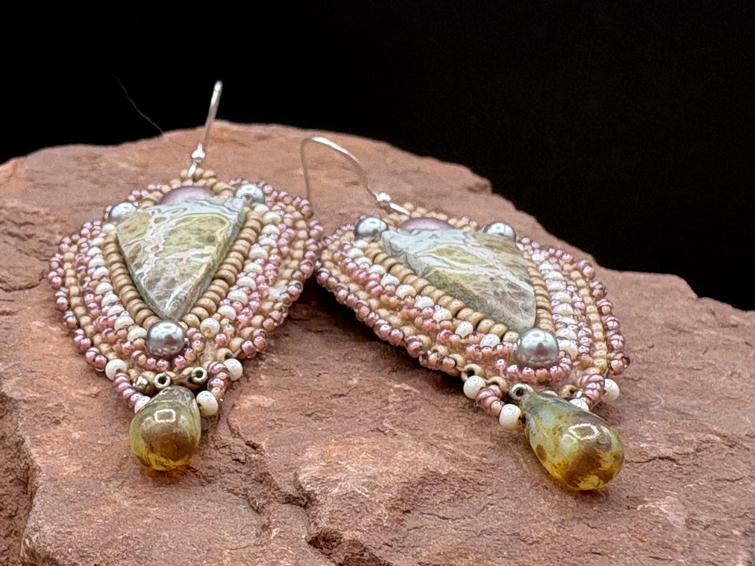 Crazy Lace Agate and Dusty Rose Glass Earrings by Sue Horine SHE62