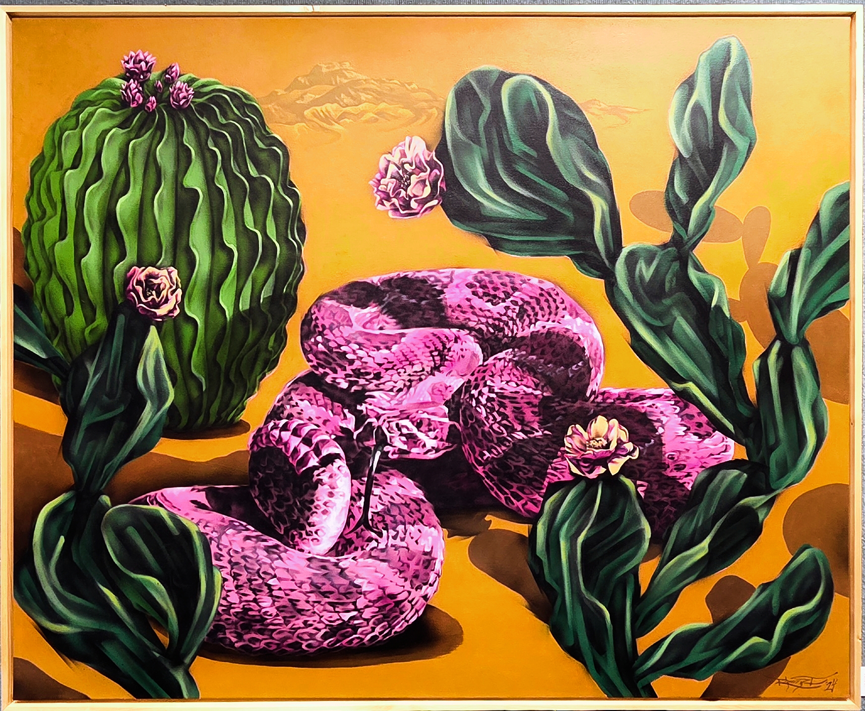 Desert Fragrance And The Soft Humm Of A Pink Rattle by Alex Rupert, done in Acrylic. The painting is 44″x 55″ and with Frame is 46″x 57″