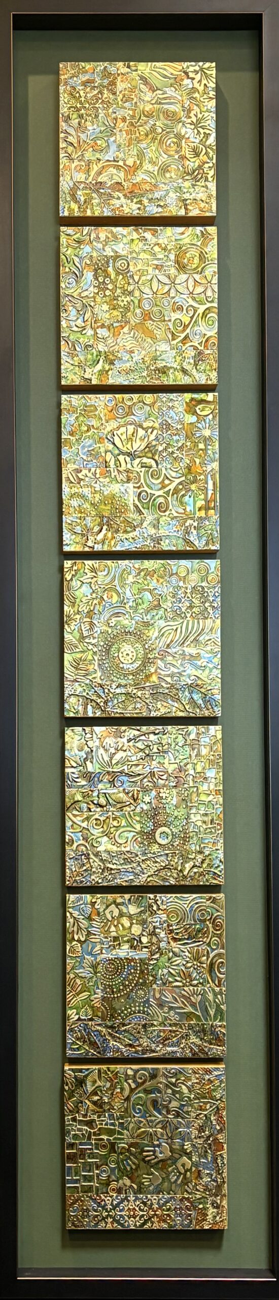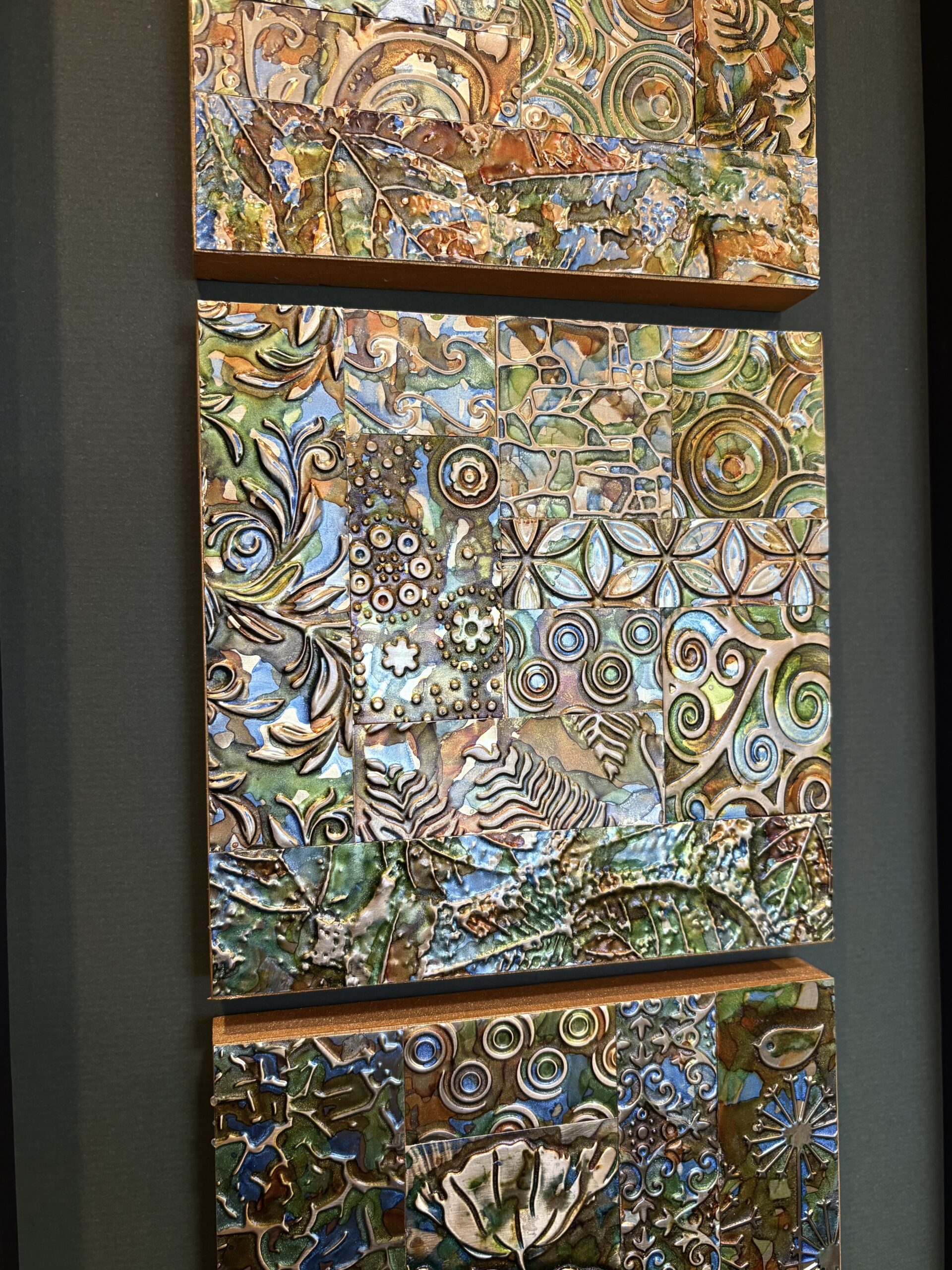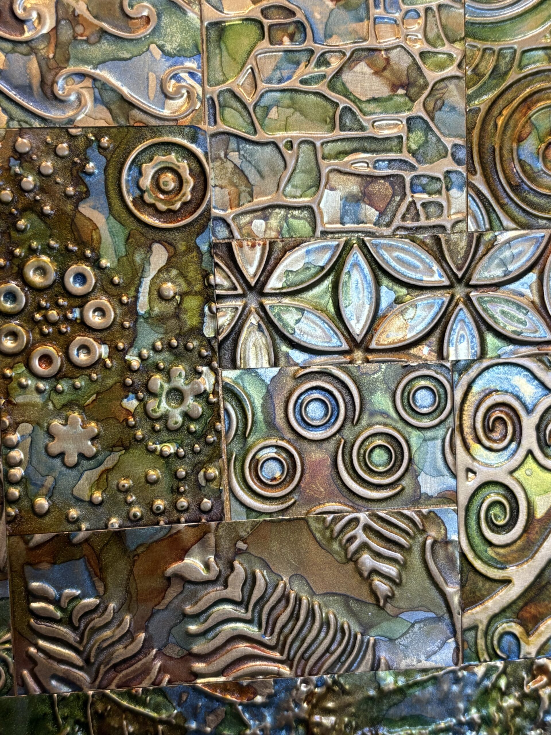 I am a new transplant to AZ. I have always lived up north and my original works reflected that environment. I have owned and operated two galleries in Pacific Northwest, along with creating works in several genres shown in other private galleries and artist owned galleries in both Montana and Idaho. Since moving to Arizona I have embraced the warm colors and styles of the Southwest. My metal embossed pieces begin with heavy metal foils in copper, brass and aluminum. They are embossed using multiple plastic embossing folders that are run through a rolling mill. I use alcohol inks to color and then begin the process of cutting and assembling my mosaics. They are somewhat like a jigsaw puzzle that I get to design and assemble! I sometimes use glass tile beads to add a little more dimension.