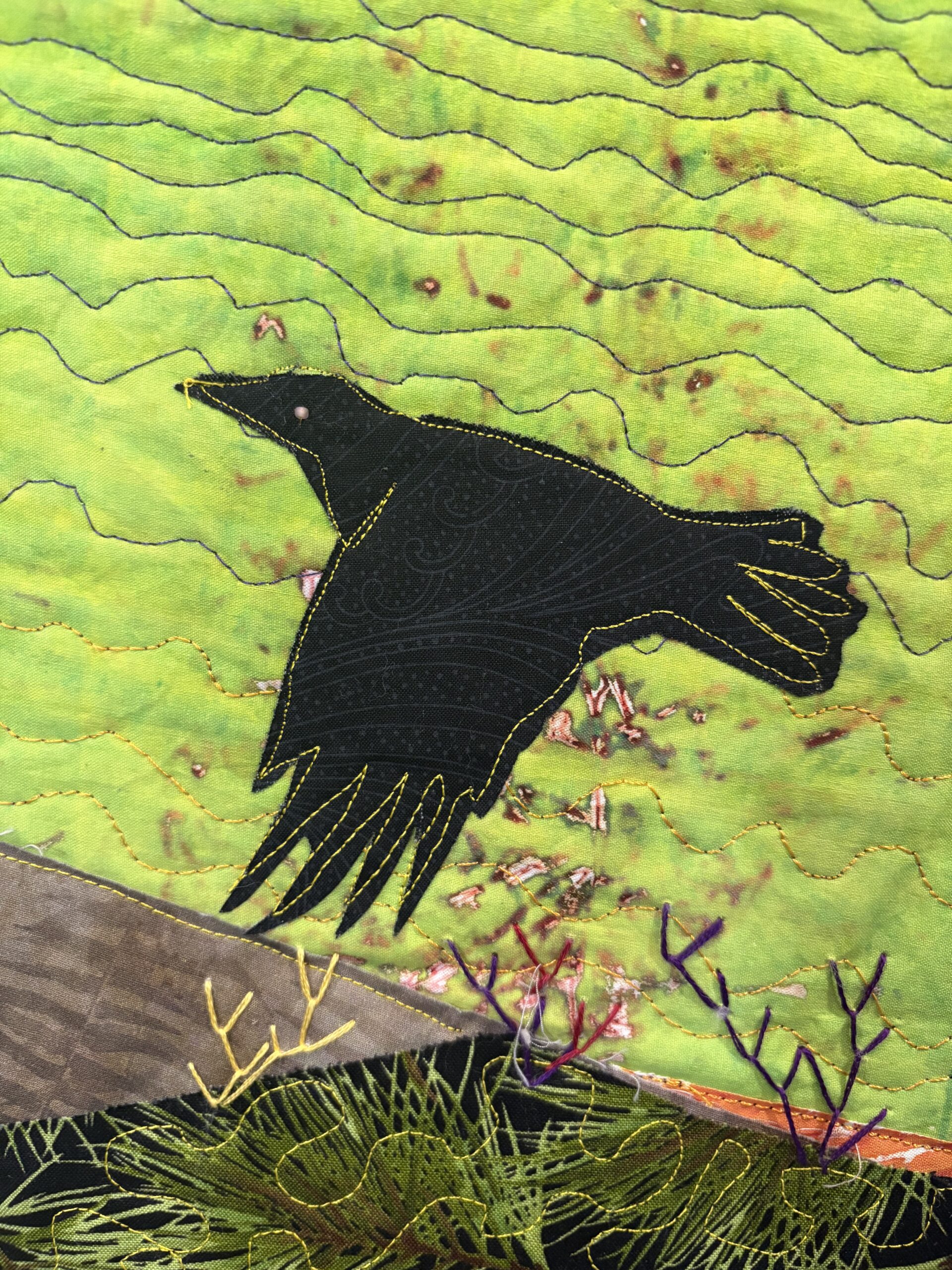 My paintings and art quilts are a balancing act between intuition and control, spontaneity and technique. My goal is to create a piece that causes you to discover something new. Even when experimenting with fused fabric collage I attempt to convey a sense of place that often includes ravens and other creatures great and small.