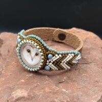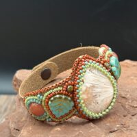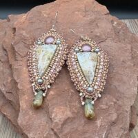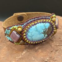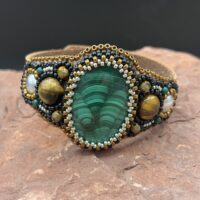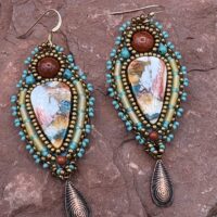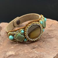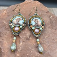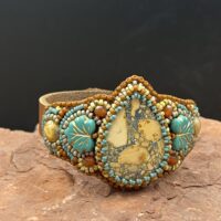 Sue Horine has been creating bead embroidered art jewelry since 2005. She was born in California and much of her inspiration comes from her childhood family vacations to the Southwest and Sierra Nevada Mountains. Primarily self-taught, her beaded jewelry has become easily recognizable as her style has developed from her love of nature and the scenic stone cabochons she incorporates in her work.