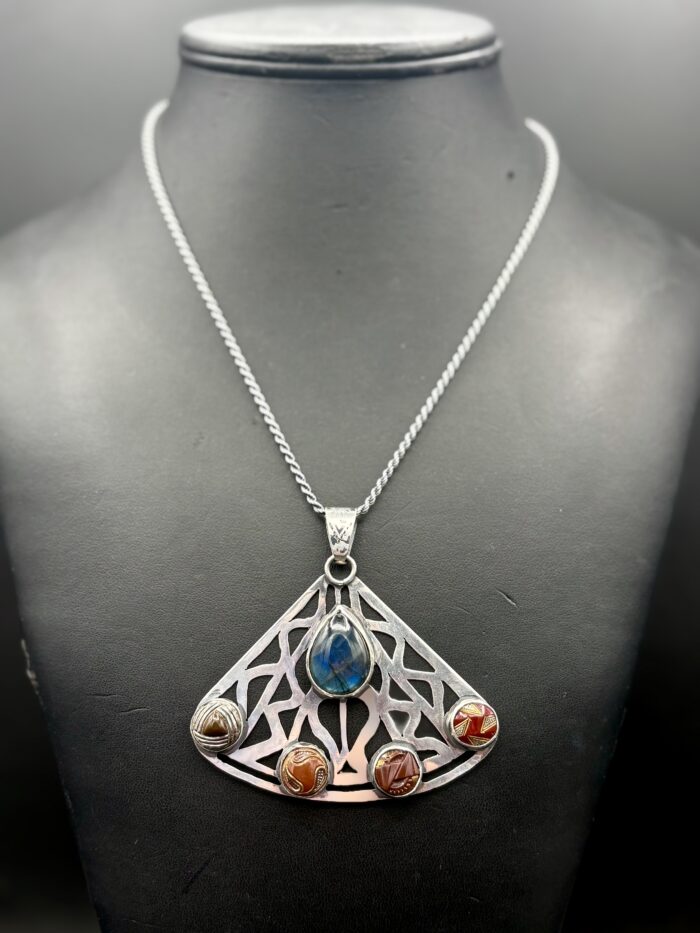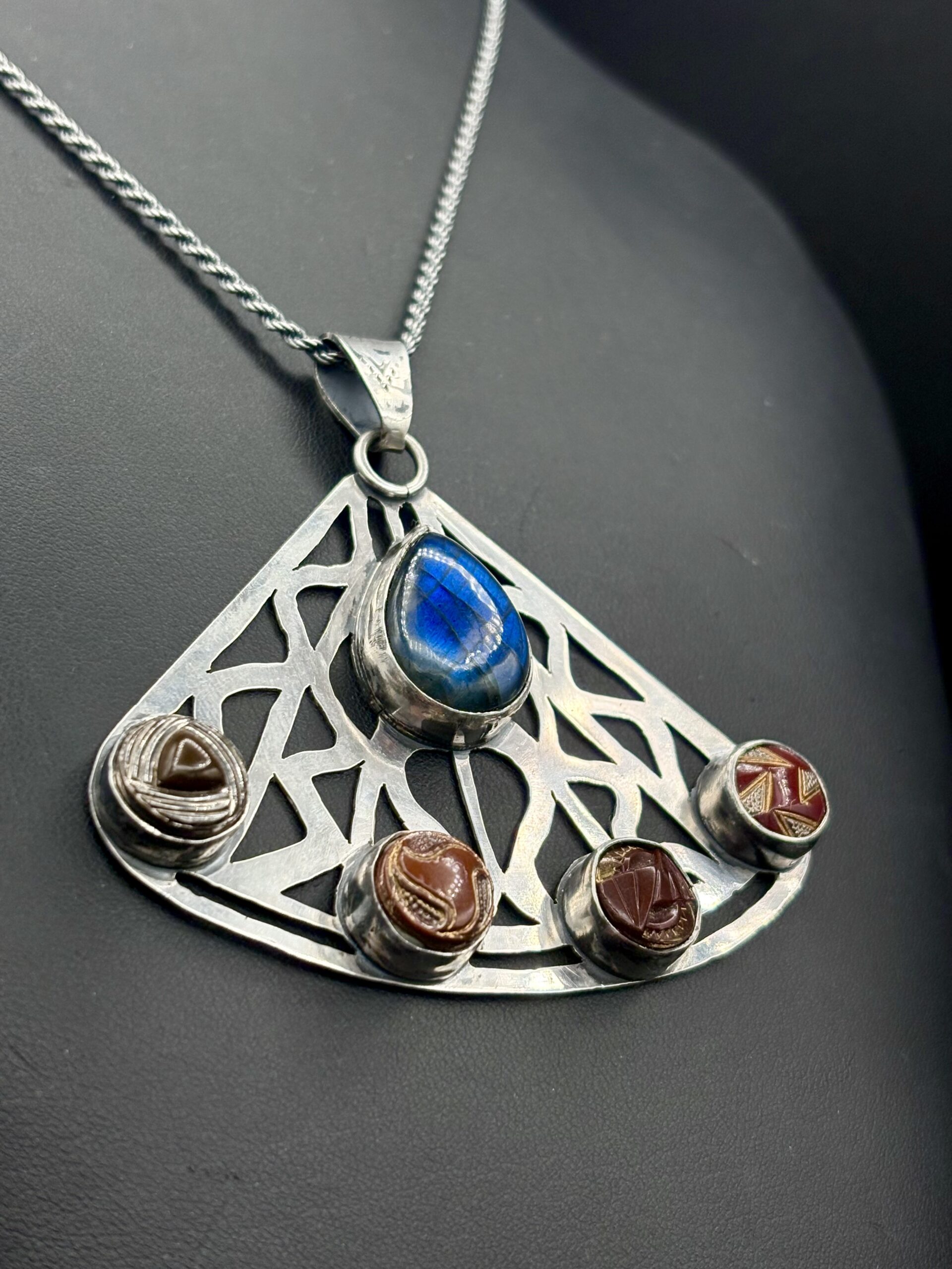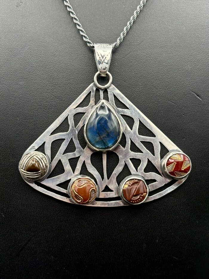 Large Lattice-Cut Pendant with Labradorite and Buttons KM006 by Kristine Mills