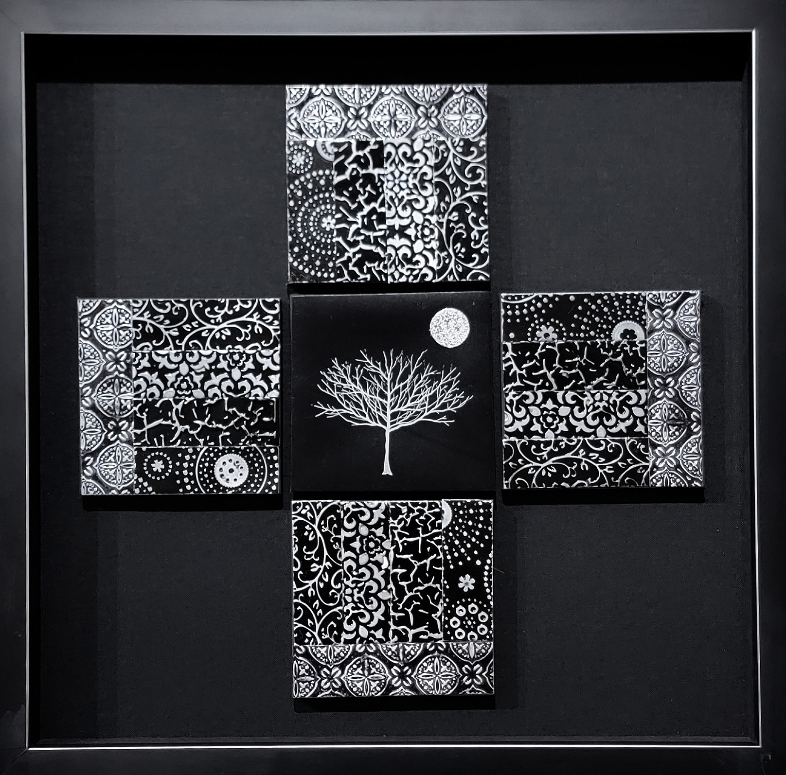 My metal embossed pieces begin with heavy metal foils in copper, brass and aluminum. They are embossed using multiple plastic embossing folders that are run through a rolling mill. I use alcohol inks to color and then begin the process of cutting and assembling my mosaics. They are somewhat like a jigsaw puzzle that I get to design and assemble! I sometimes use glass tile beads to add a little more dimension.