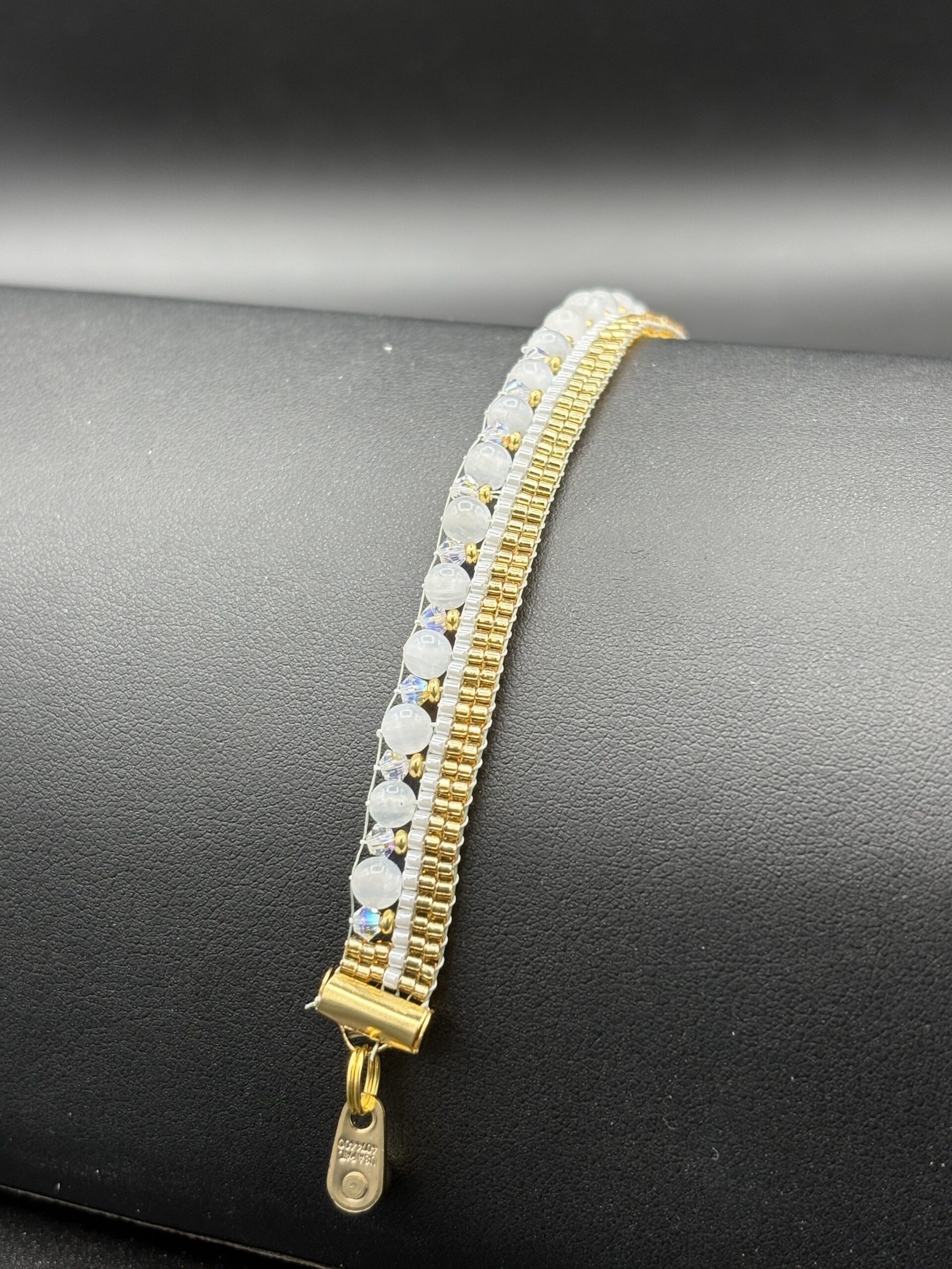 Nancy’s sister, Donna, gifted her a bead loom. She is inspired by the ancient history and relative culture of beading. She creates organically and intuitively, weaving with Miyuki Glass Seed Beads. Miyuki beads are an essential part of Japanese textile and jewelry-making traditions, with a long history of craftsmanship and precision. Her beadwork may include the use of crystals, a variety of Jaspers, Turquoise, Carnelian, Onyx, Tiger’s Eye, Quartz, Opalite, Lapis Lazuli and Labradorite and Mother of Pearl and Crystals.