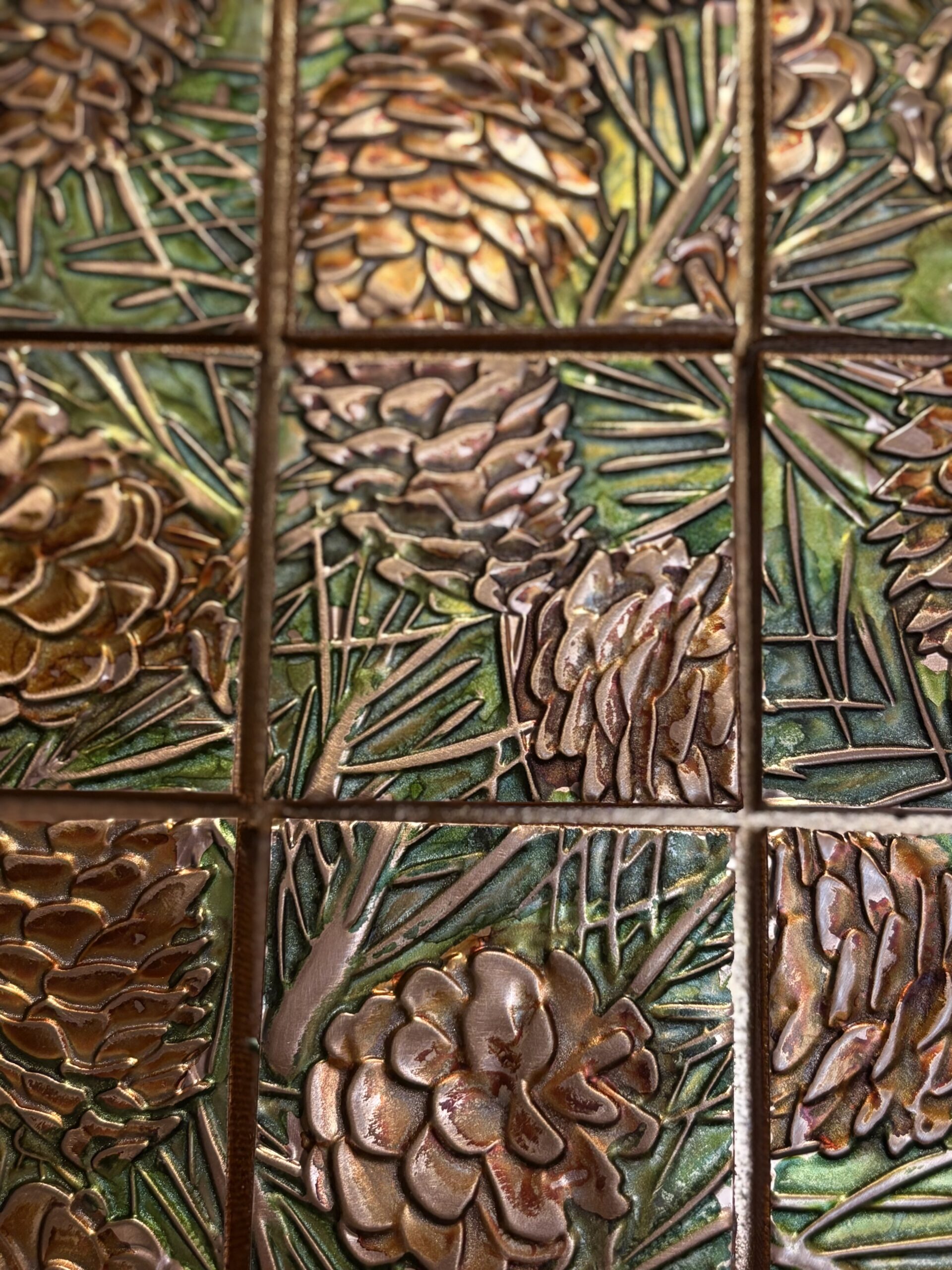 I am a new transplant to AZ. I have always lived up north and my original works reflected that environment. I have owned and operated two galleries in Pacific Northwest, along with creating works in several genres shown in other private galleries and artist owned galleries in both Montana and Idaho. Since moving to Arizona I have embraced the warm colors and styles of the Southwest. My metal embossed pieces begin with heavy metal foils in copper, brass and aluminum. They are embossed using multiple plastic embossing folders that are run through a rolling mill. I use alcohol inks to color and then begin the process of cutting and assembling my mosaics. They are somewhat like a jigsaw puzzle that I get to design and assemble! I sometimes use glass tile beads to add a little more dimension.