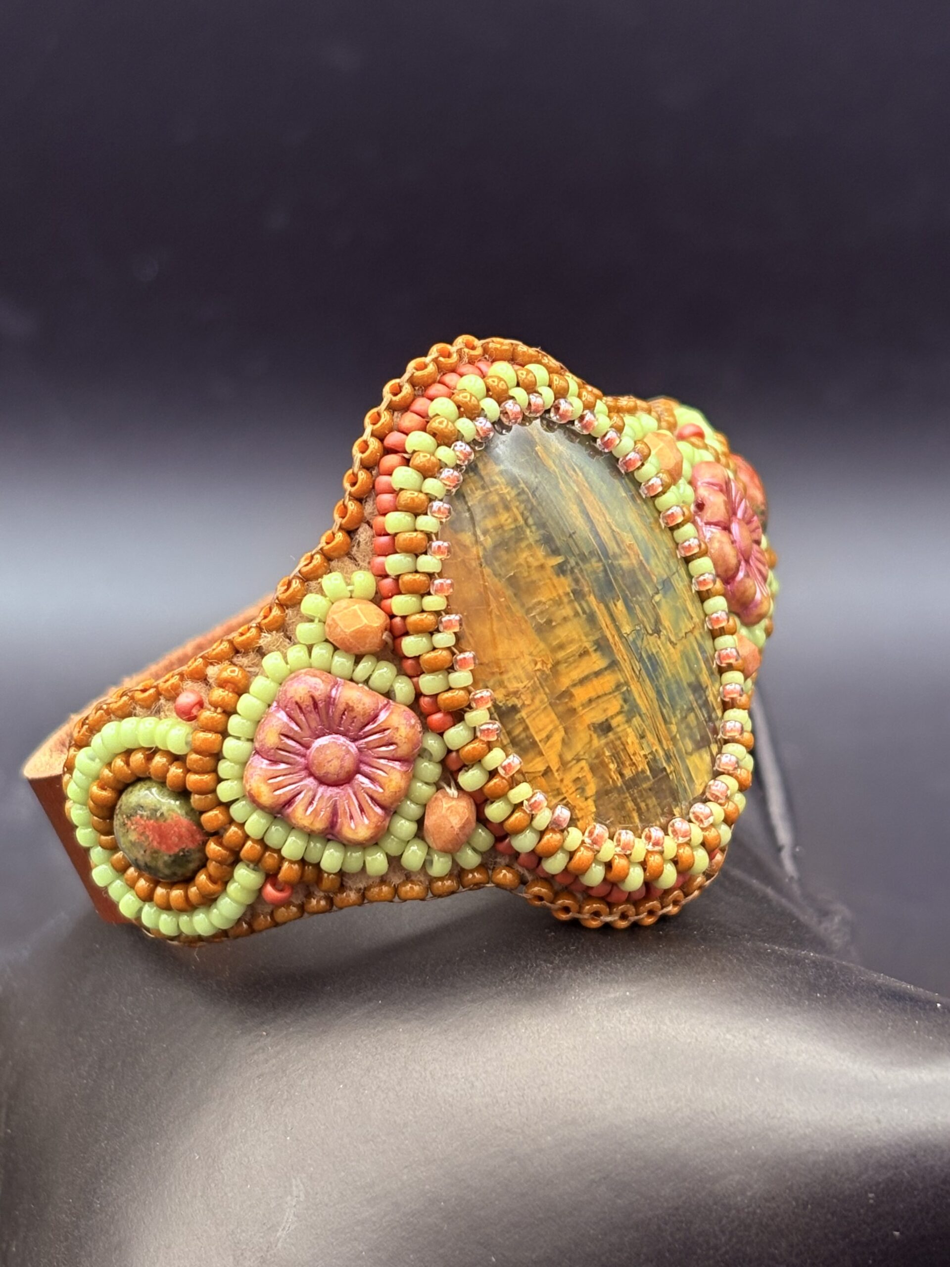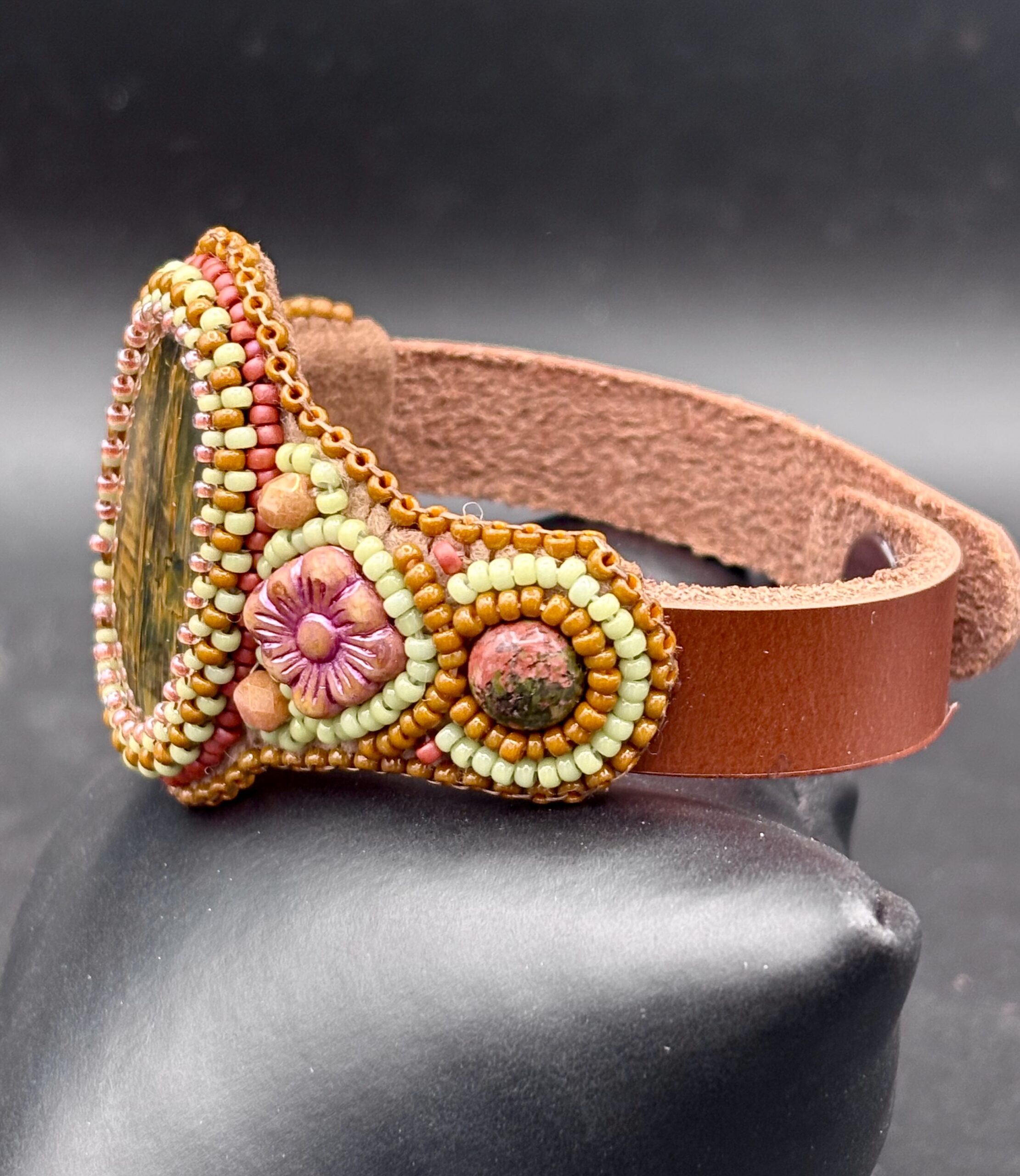 Neelite and Unakite Pink Flower Leather Cuff C23 by Sue Horine