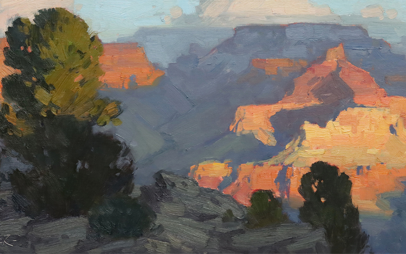 Misc. – Sun screen, wide brimmed hat, insect repellent, camera to get reference photos, umbrella (can help to keep you cooler and keep the sun off your easel, but not entirely necessary). Wear clothes you will not be worried about getting paint on. This one’s important – dark colored shirts, raincoat, etc. (blue, gray, black) are best so they don’t reflect light onto your panel. A backpack to carry it all! Organize items so they can fit into a single pack. You can attach your easel to this or carry it separately. Any hiking we do for the class will be short; however, it’s best to be able to get to your painting location in a single trip from your car.