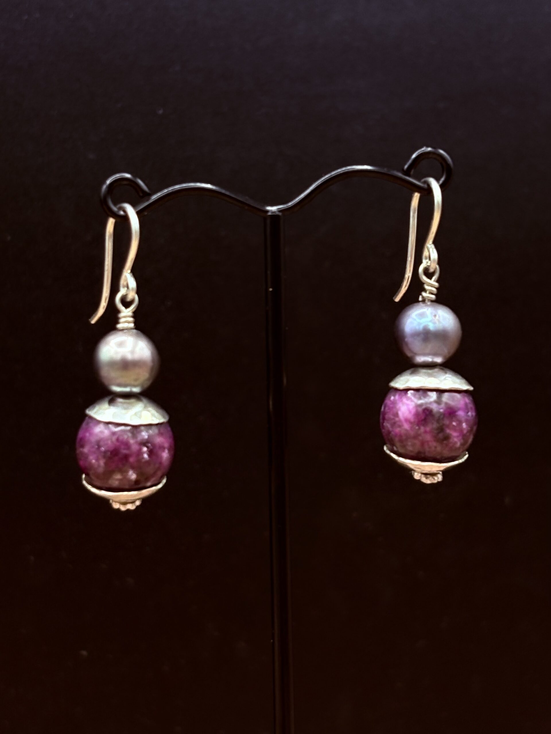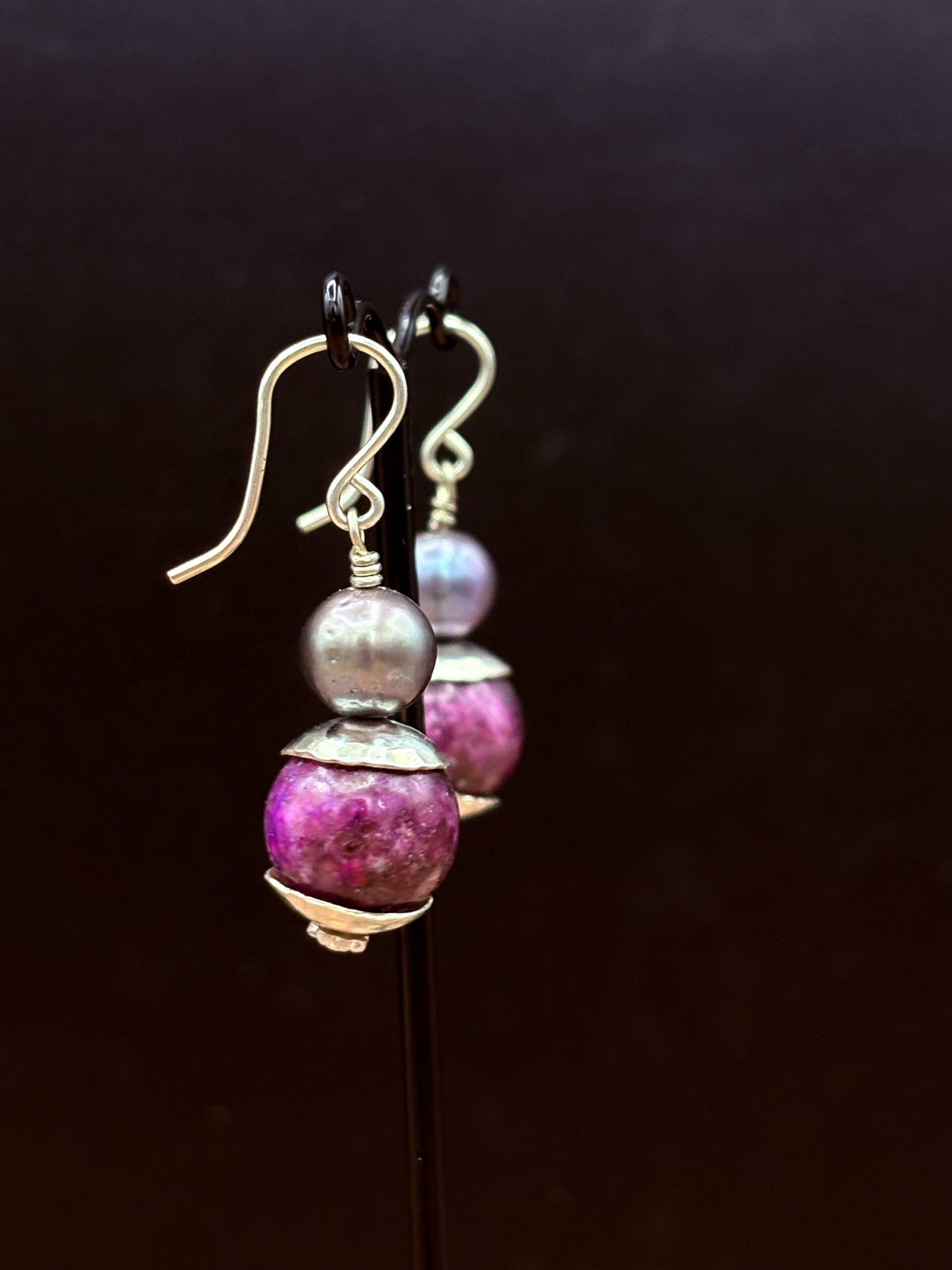 Purple Mica Earrings with Sterling Caps and Tahitian Pearls by Tom Yazzie TYE-844