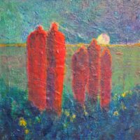 Afterward, I contemplated what, if anything, this meant. I was moved to go to my studio and started to allow a surge of energies, who identified themselves as The Guardians, to flow through me. I believe these paintings have to do with those beings, unseen and seen, who land on our shoulder or take our hand, letting us know that they are around in myriad forms to uplift, inspire and bring joy to our hearts, especially in these current times.