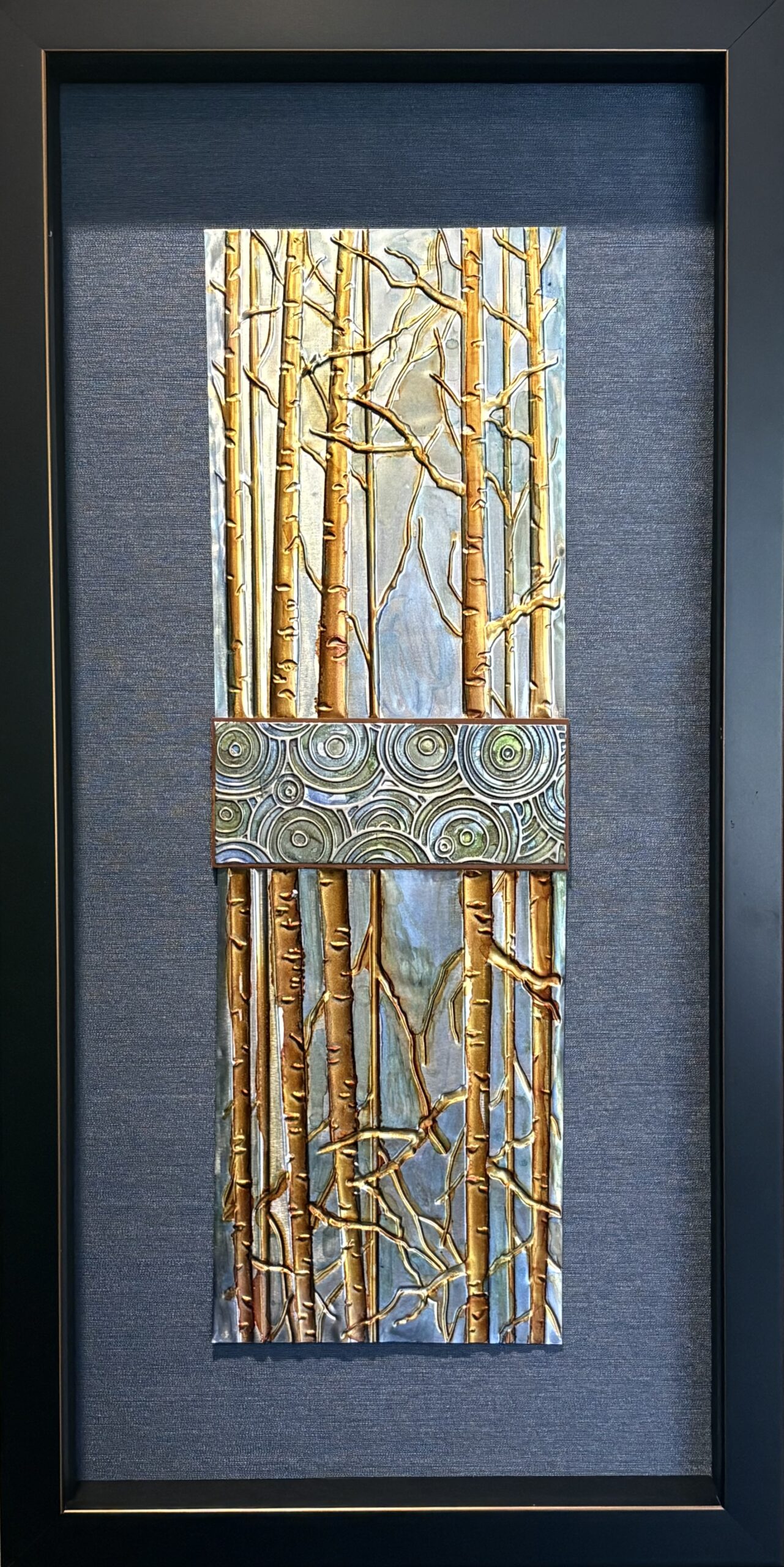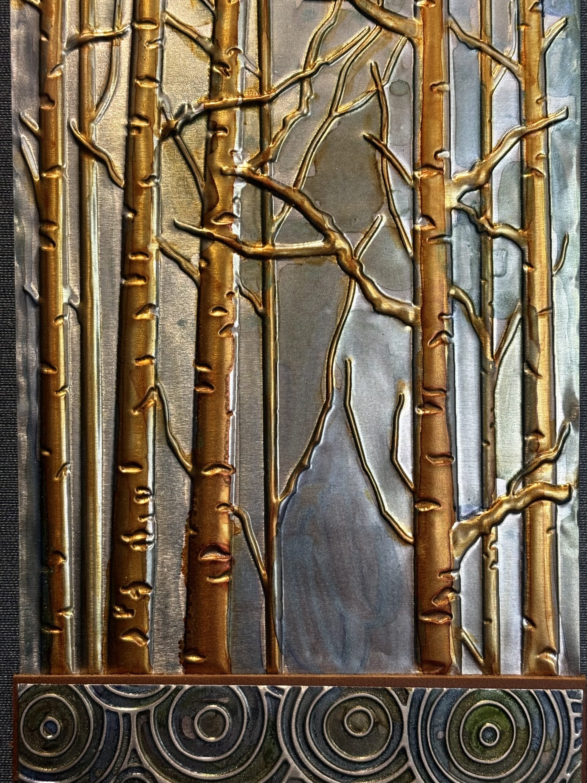 I am a new transplant to AZ. I have always lived up north and my original works reflected that environment. I have owned and operated two galleries in Pacific Northwest, along with creating works in several genres shown in other private galleries and artist owned galleries in both Montana and Idaho. Since moving to Arizona I have embraced the warm colors and styles of the Southwest. My metal embossed pieces begin with heavy metal foils in copper, brass and aluminum. They are embossed using multiple plastic embossing folders that are run through a rolling mill. I use alcohol inks to color and then begin the process of cutting and assembling my mosaics. They are somewhat like a jigsaw puzzle that I get to design and assemble! I sometimes use glass tile beads to add a little more dimension.