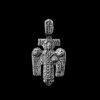 The traditional Russian Orthodox Catholic 3-bar cross is on the front of the cross. Also on the front of the cross, above the top bar is the Slavonic abbreviation of King of Glory wich replaces Ponyious Pilate’s mocking title, INRI, which is found on Western crosses.