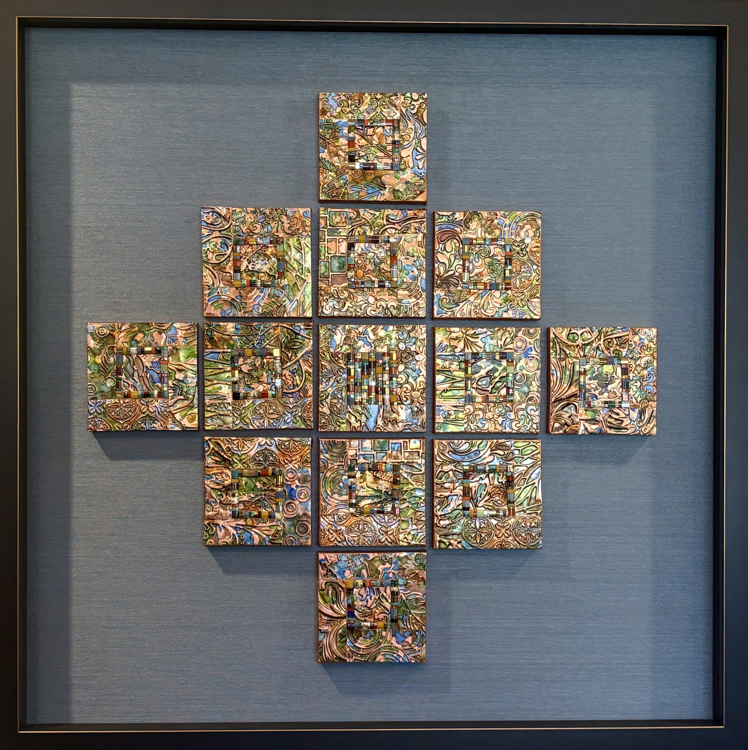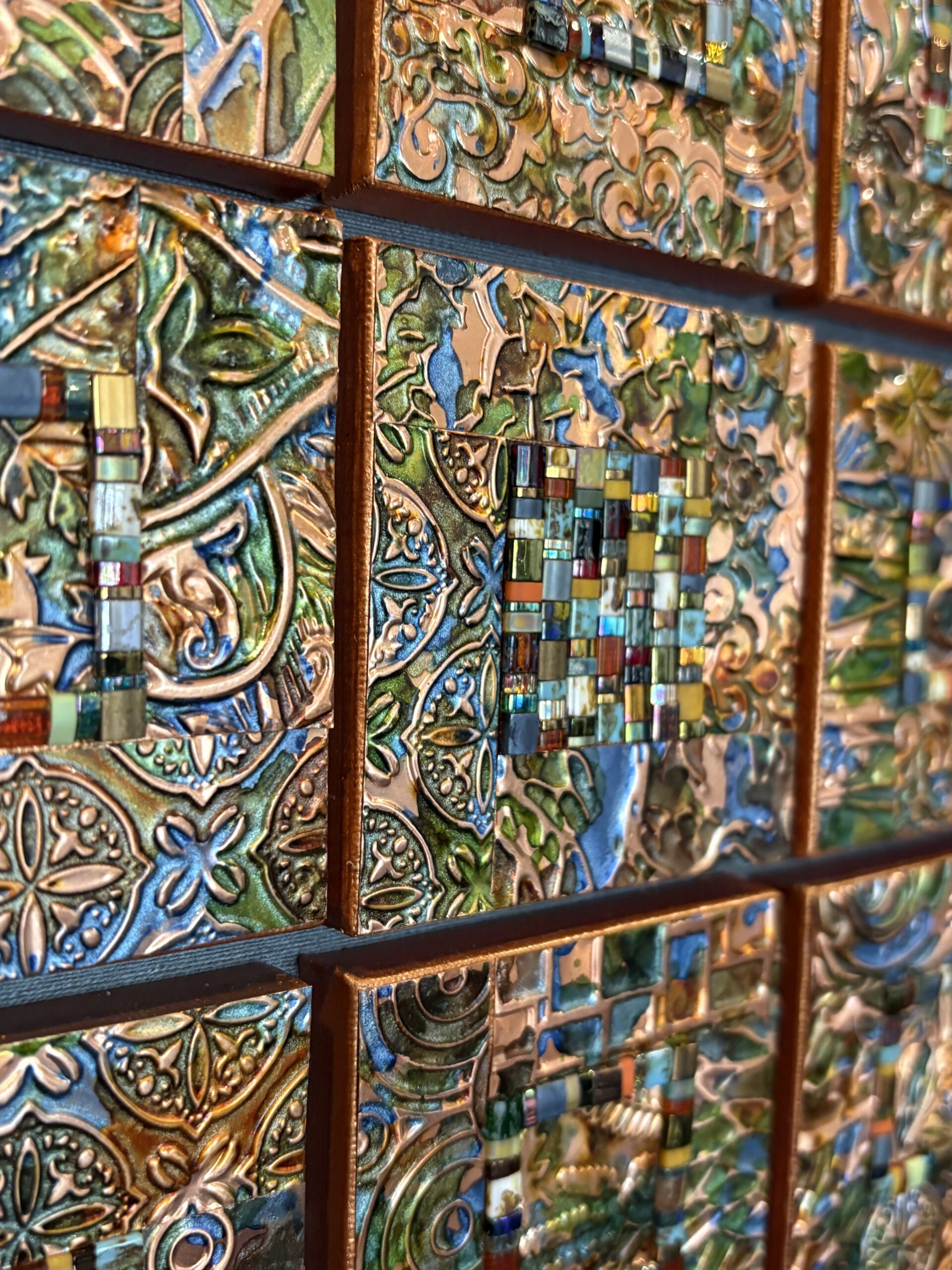 I am a new transplant to AZ. I have always lived up north and my original works reflected that environment. I have owned and operated two galleries in Pacific Northwest, along with creating works in several genres shown in other private galleries and artist owned galleries in both Montana and Idaho. Since moving to Arizona I have embraced the warm colors and styles of the Southwest. My metal embossed pieces begin with heavy metal foils in copper, brass and aluminum. They are embossed using multiple plastic embossing folders that are run through a rolling mill. I use alcohol inks to color and then begin the process of cutting and assembling my mosaics. They are somewhat like a jigsaw puzzle that I get to design and assemble! I sometimes use glass tile beads to add a little more dimension.