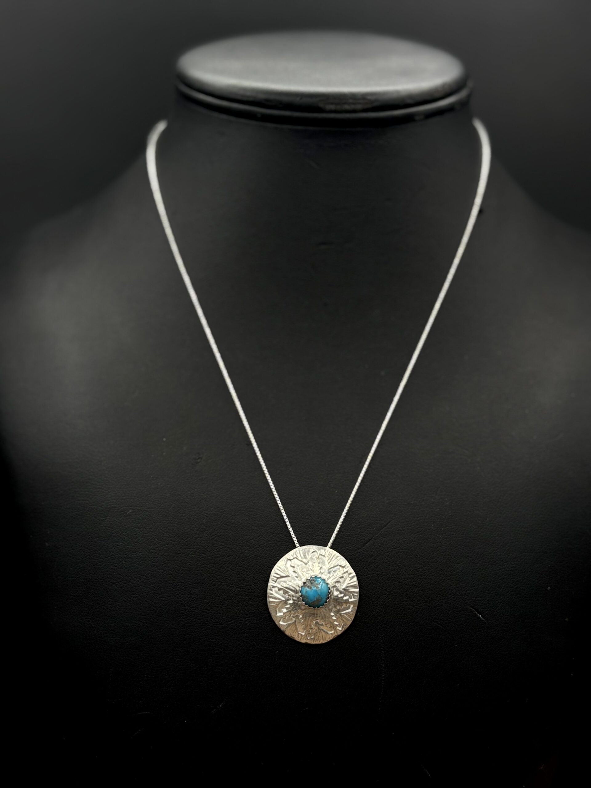 Sterling Silver Convex Basket Design Pendant with 8mm Kingman Turquoise by Tom Yazzie TYP-611