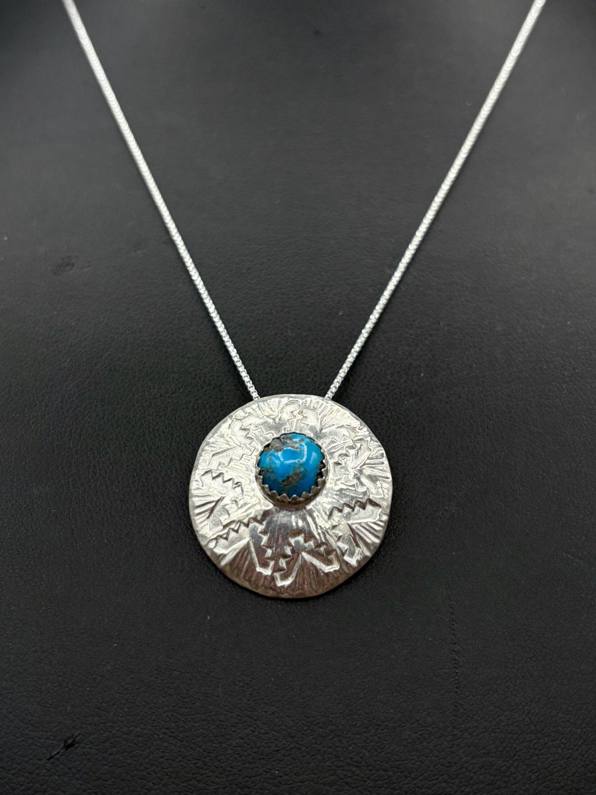 Sterling Silver Convex Basket Design Pendant with Turquoise by Tom Yazzie TYP-611
