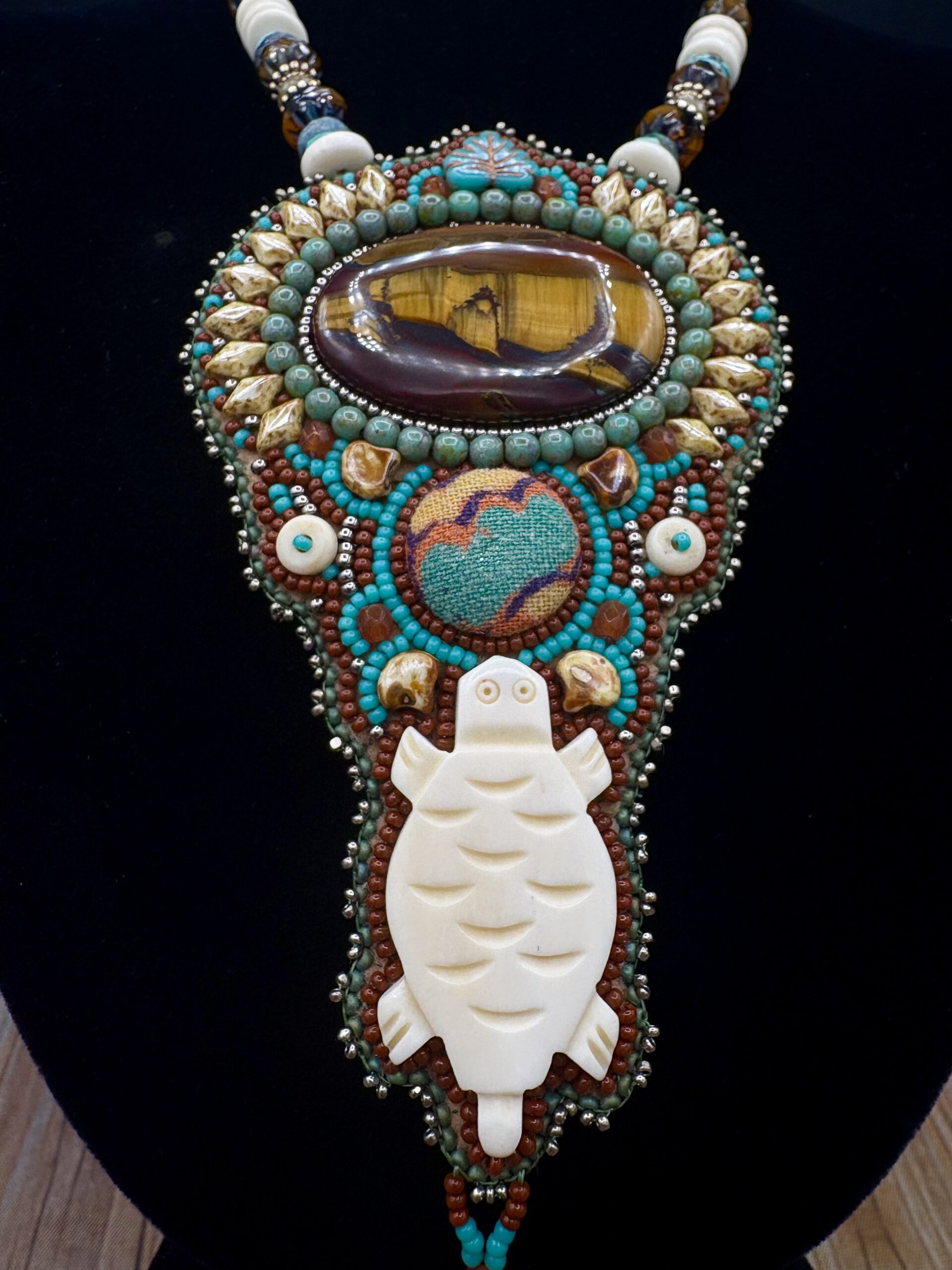 Tiger Iron with Carved Bone Turtle Fabric Turquoise plus Bone beaded Necklace by Sue Horine N39