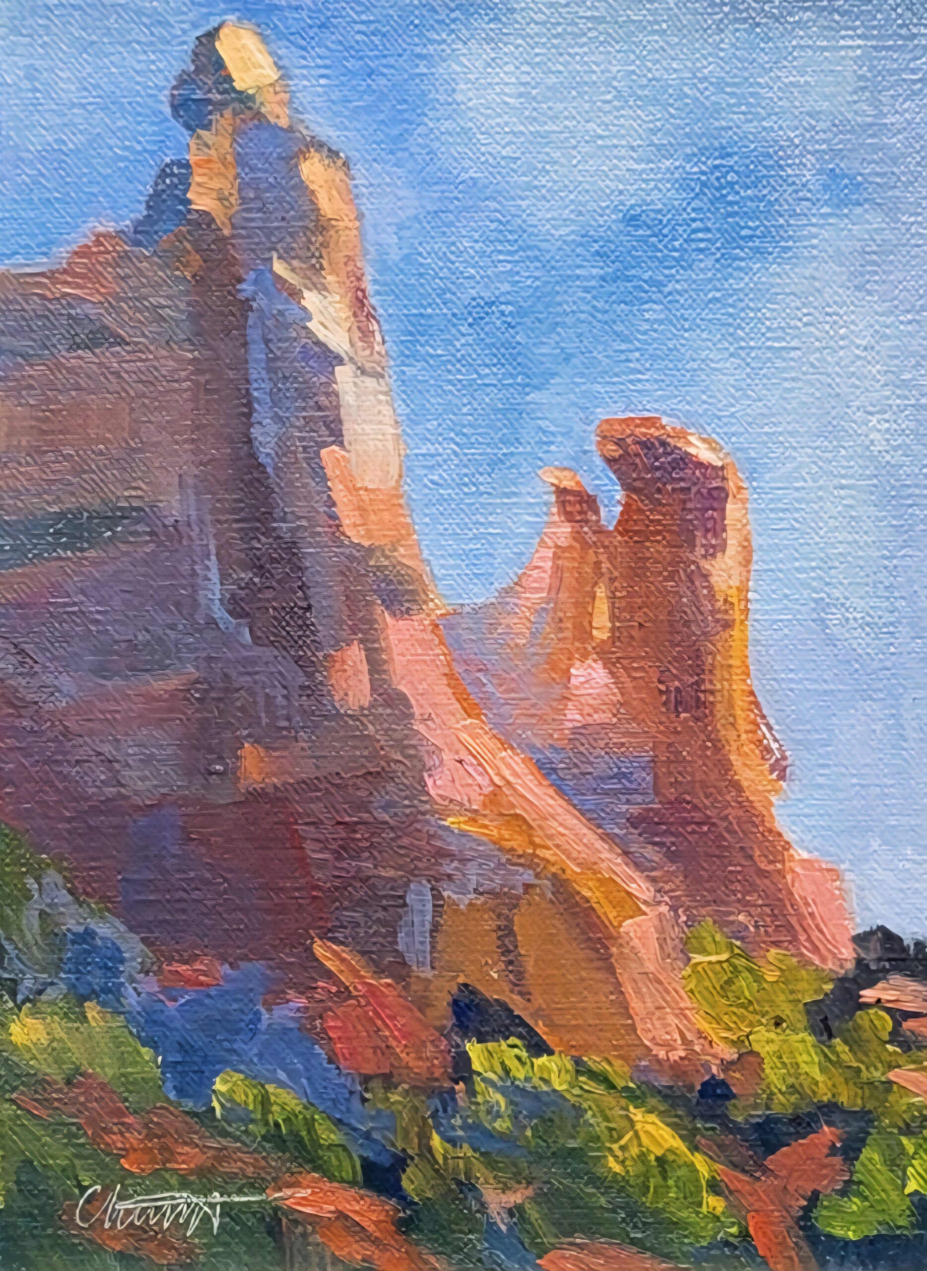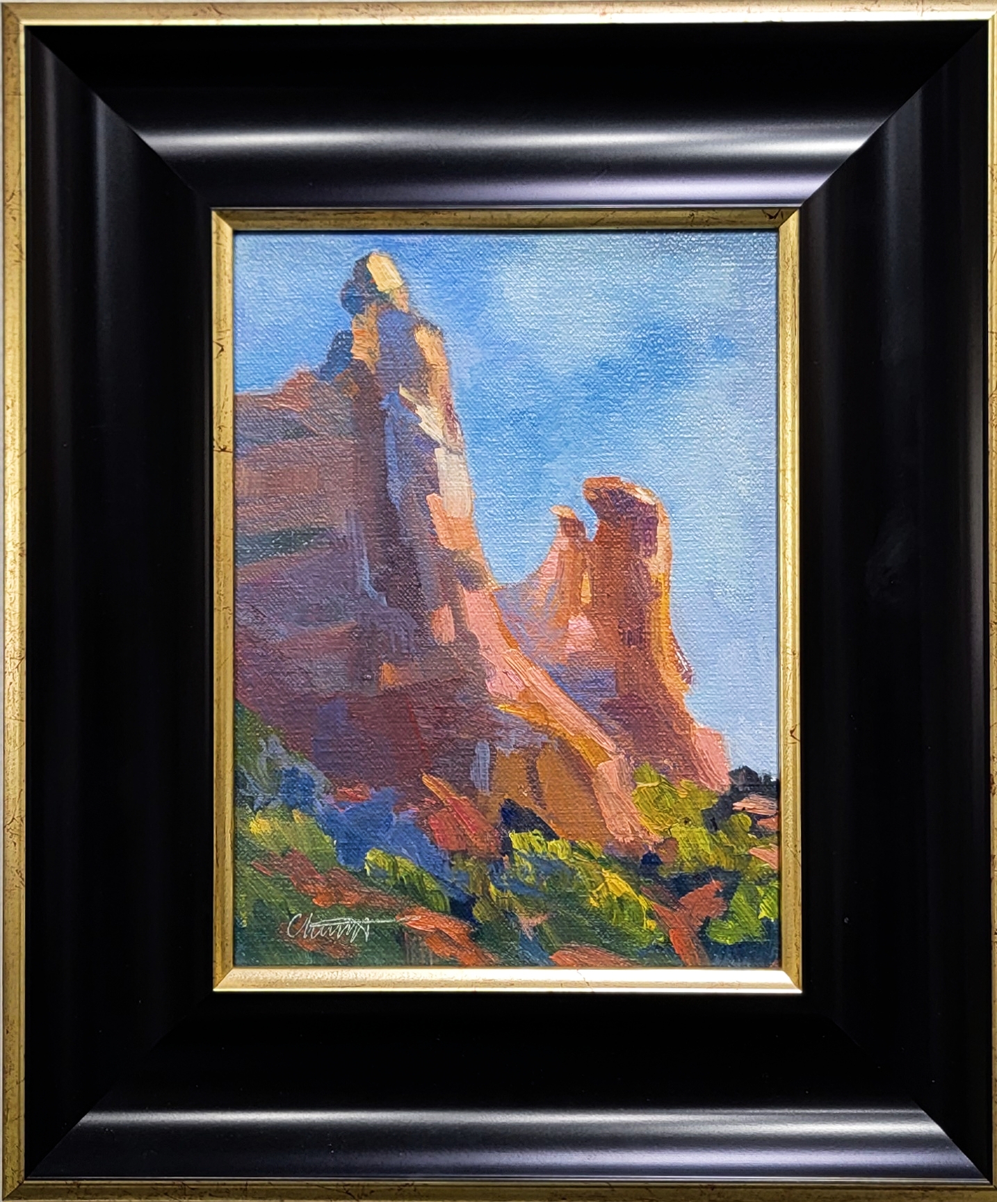 My favorite shoes are hiking boots. For years I've explored the wildernesses of the Southwest, hiking, backpacking, hang gliding and mountain biking - interacting with our wild places up close and in person. This has profoundly influenced my work. I believe we are incomplete without a connection to, and appreciation of, the natural world, and that we should cherish and protect it. To honor that end, I create impressionist/realism oil paintings for those who love the Southwest landscape and wildlife, so that my collectors can share in that spiritual relationship. I want to promote deeper respect and connection with our vanishing wild places and the creatures that call them home. Casey Cheuvront studied drawing, painting, sculpture and ceramics at CSUF California, and has been influenced (and instructed) by current artists like Douglas Fryer, Bill Cramer, Dave Santillanes, Alan Wolton, Matt Smith, Stanley Kurth, Casey Klahn, and Camille Przewodek. Her work is informed not only by formal study but also by her ongoing plein air habit and life-long appreciation of the natural world, established through a "feet-on-the trail" connection over many years. Her outdoor education began when she was very young, accompanying her father on long treks, fishing, hiking, bow-hunting, archery exhibitions and professional competitive archery shoots. Later, she backpacked her way across the Sierras and the Uintas, flew California peaks in her hang glider, skied Utah powder, and mountain biked many happy trails in the Arizona desert. Cheuvront’s pieces reveal an ongoing fascination with the Western and Southwestern wilderness, whether reflected in a local trail or a remote lake only reachable by a long backpack. Her enthusiasm is translated into a vibrant, modern palette and energetic, dynamic brushwork. Look for studio and plein air works showcasing the Yosemite highlands, Sonoran desert, and the red rocks of Sedona.
