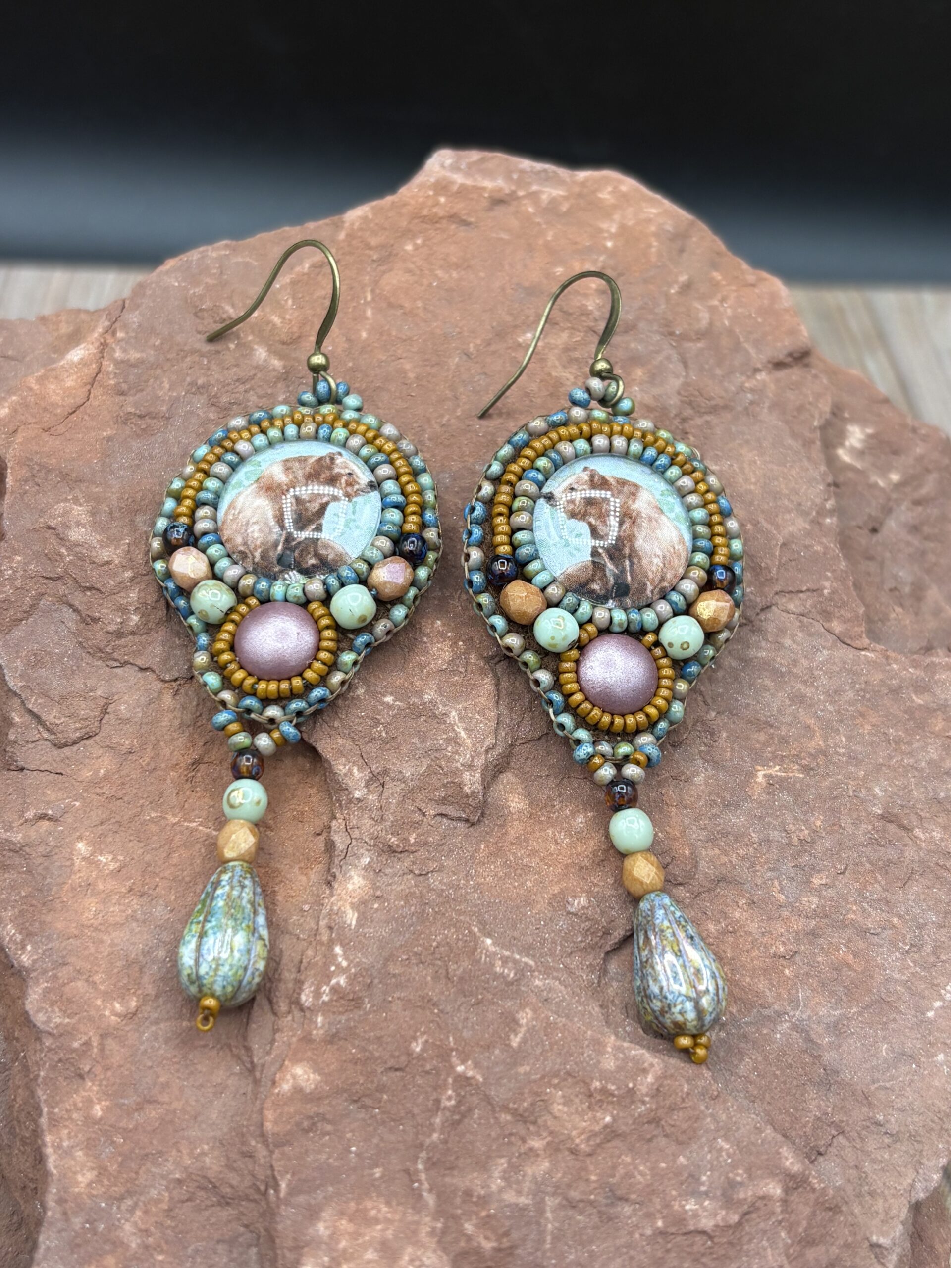 Original Watercolor Bear Art Print Earring with Glass Dangle and Antiqued Brass Ear Wires by Sue Horine SHE66