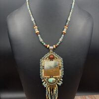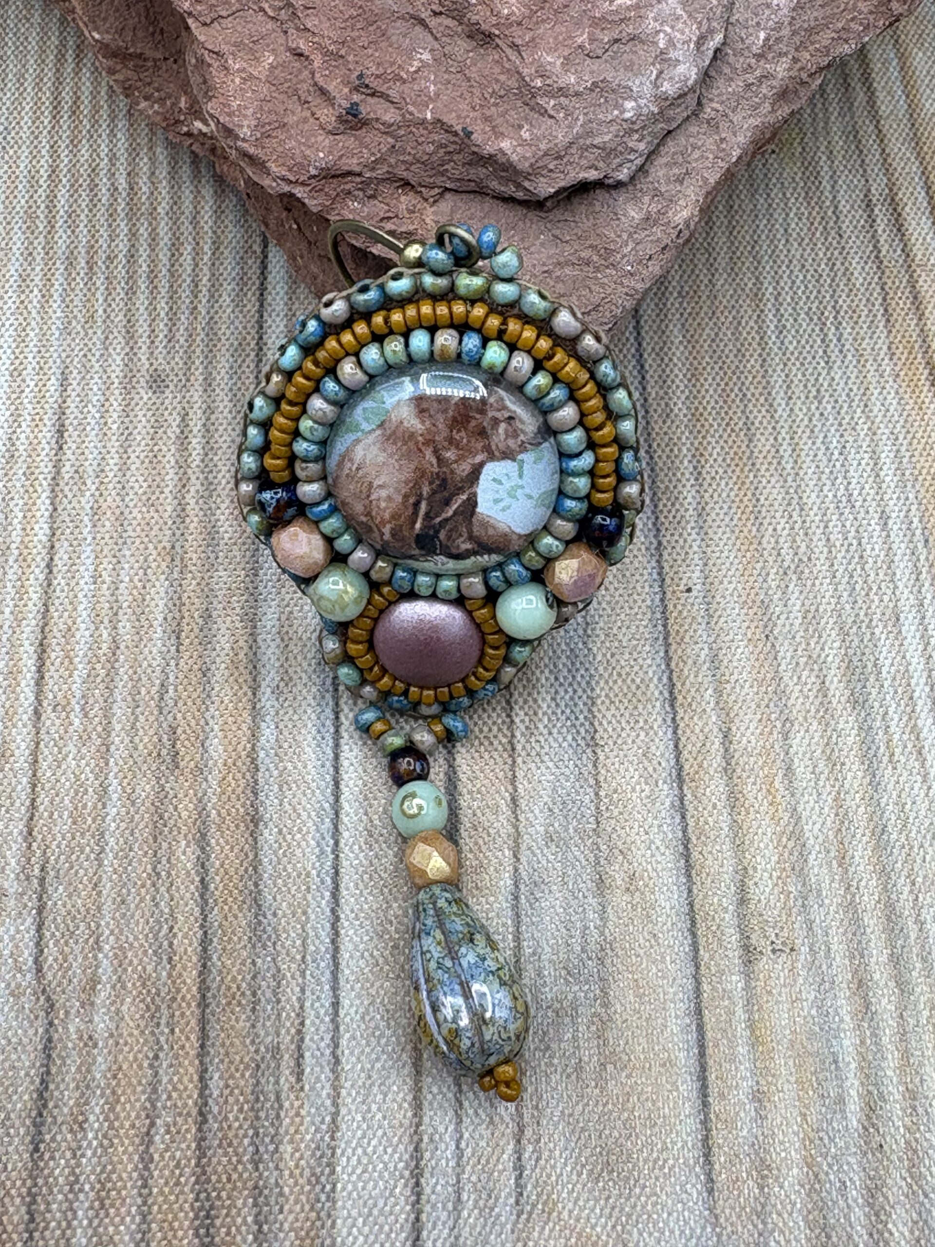 Sue Horine has been creating bead embroidered art jewelry since 2005. She was born in California and much of her inspiration comes from her childhood family vacations to the Southwest and Sierra Nevada Mountains. Primarily self-taught, her beaded jewelry has become easily recognizable as her style has developed from her love of nature and the scenic stone cabochons she incorporates in her work.