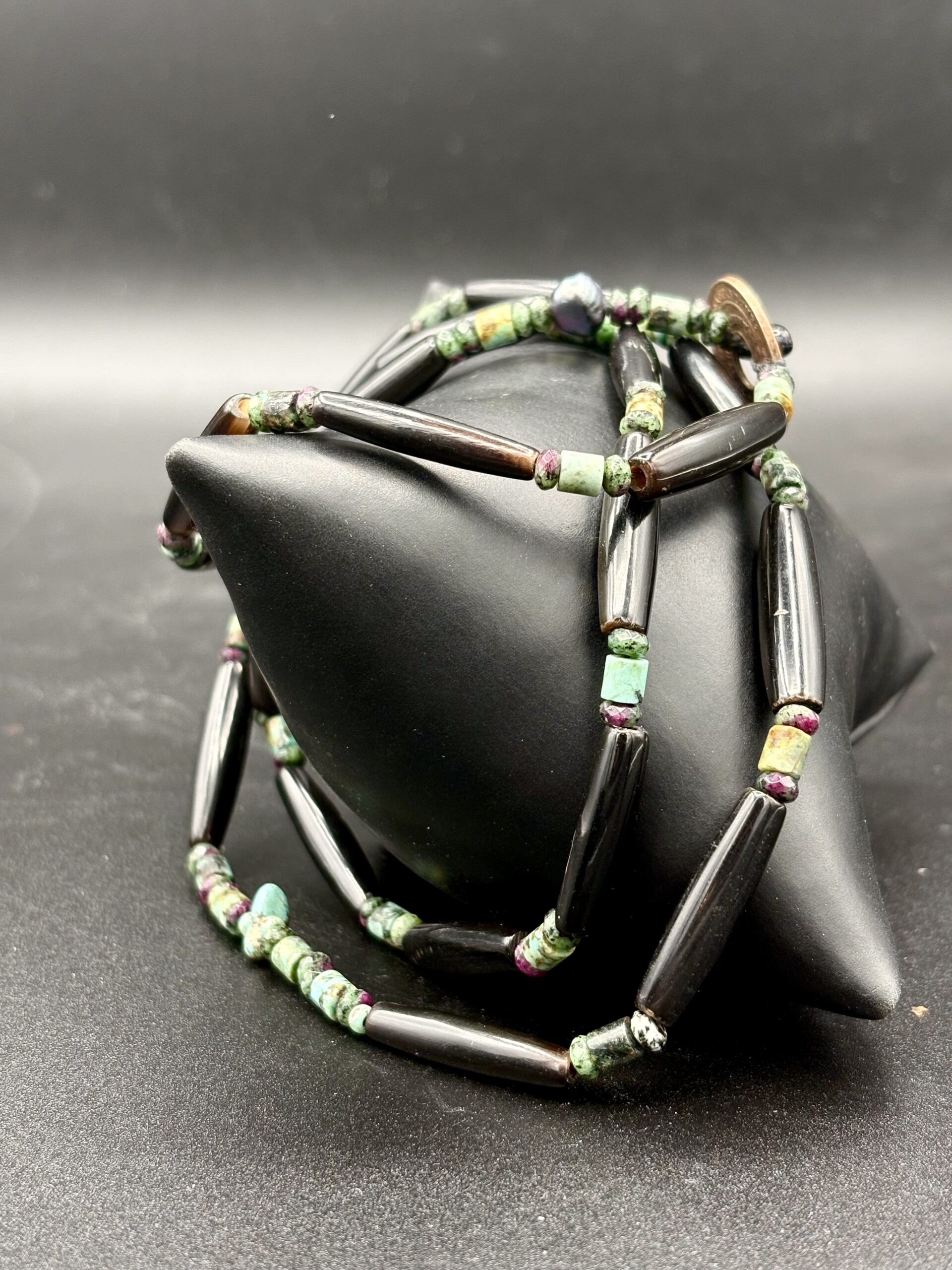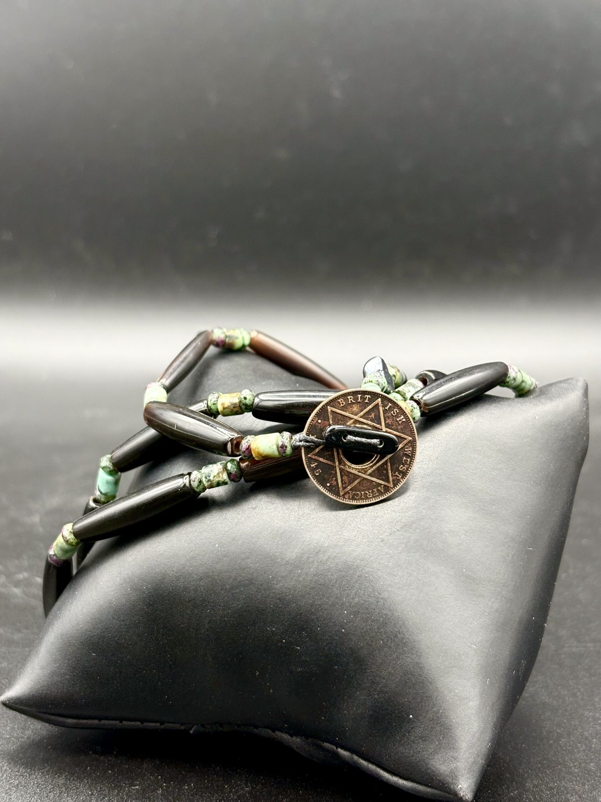 “West African Buffalo Wrap” handmade by artist Smokey Cruz can be worn as a necklace or a wrap bracelet.